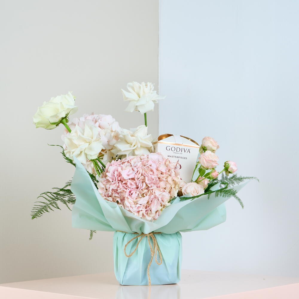 Подарите любимому человеку непревзойденное наслаждение этой роскошной цветочной композицией. Этот букет, сочетающий нежные пастельные оттенки с нежными розами и цветущими гортензиями, идеально подойдет для любого особого случая. В сочетании с коробкой роскошных шоколадных конфет Godiva Masterpieces эта композиция обещает передать элегантность и изысканность в одном потрясающем оформлении. Упакованный в мятно-зеленый цвет с очаровательным бантом из бечевки, этот подарок обязательно произведет неизгладимое впечатление. Информация о подарке: Гортензия Розы Кустовые розы Аспарагус Godiva