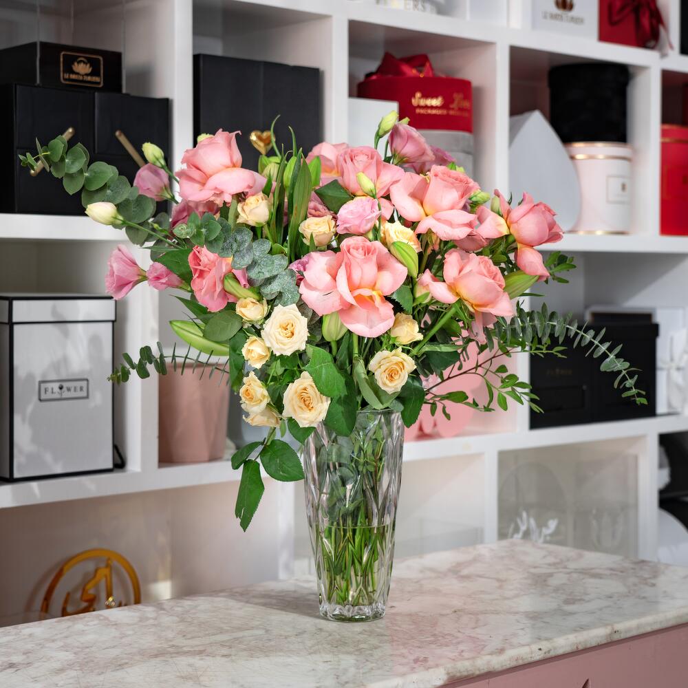 Прозрачная ваза, демонстрирующая симфонию красоты. Семь чарующих розовых роз танцуют рядом с двумя нежными персиковыми мини-розами, двумя величественными лилиями и двумя цветками астомы, все окружённые зелёными акцентами рускуса.