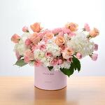 белые гортензии - 4 шт. мерцающие розы - 9 шт. розовые розы Джульетты - 9 шт.