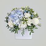 white lisianthus - 3 шт. белые восковые цветы - 2 шт. белый гвоздика - 1 шт. light blue hydrangeas - 2 шт.