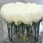 Эта потрясающая композиция представляет ослепительно белые розы, установленные вертикально в современной прозрачной акриловой коробке. Прозрачная конструкция демонстрирует стебли целиком, создавая ощущение роскоши и современности. Ярко-розовые розы символизируют восхищение, признательность и радость, делая её идеальным подарком к празднику, в знак любви или благодарности. Идеально для элегантного декора или искреннего подарка.