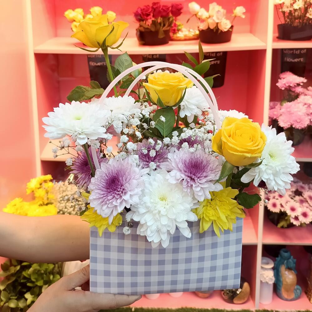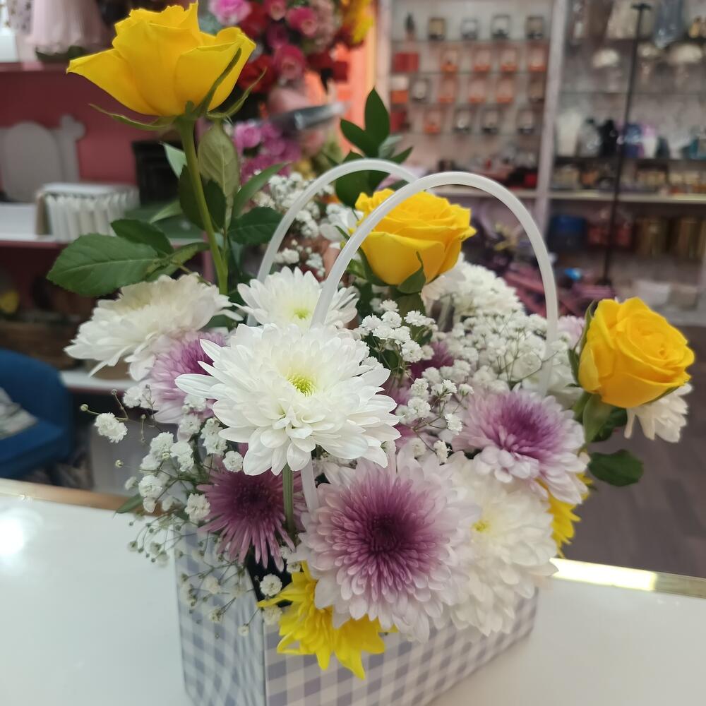 Chrysanthemum white - 1 шт. rose - 3 шт. gipsophila - 1 шт. хризантема желтая - 1 шт. листья рускуса - 2 шт. paper bag - 1 шт. хризантема махровая фиолетовая - 1 шт.