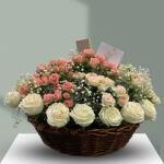 Подарочная корзина, наполненная цветами, сделает ваш день особенным. Белые розы, розы сорта Спра и гипсофила, дополненные всеми цветами, создают потрясающую цветочную композицию в корзине.