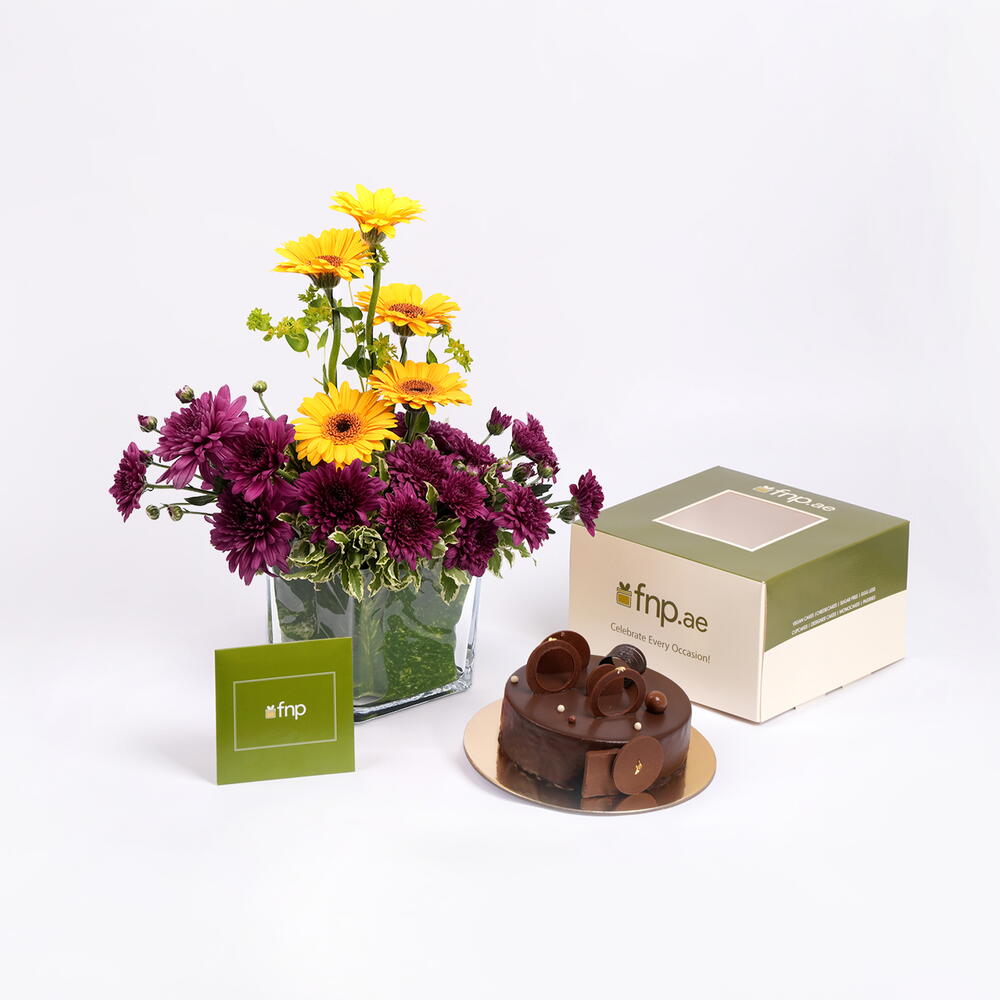 5 желтых гербер, 1 желтый буплеурум Гриффита (наполнитель), 3 фиолетовые хризантемы евро (наполнитель), 2 серебристых питтоспорума (наполнитель из мелких листьев), 2 зеленых потоса (наполнитель из листьев), 1 локальный пенополиуретан Foam Oasis, 1 прозрачная квадратная стеклянная ваза, 1 шоколадный фадж-кейк (полкг)