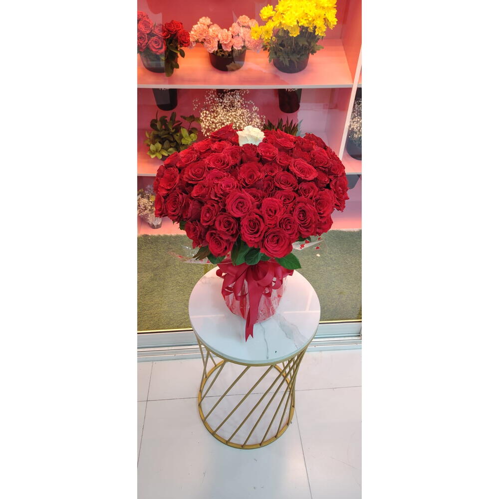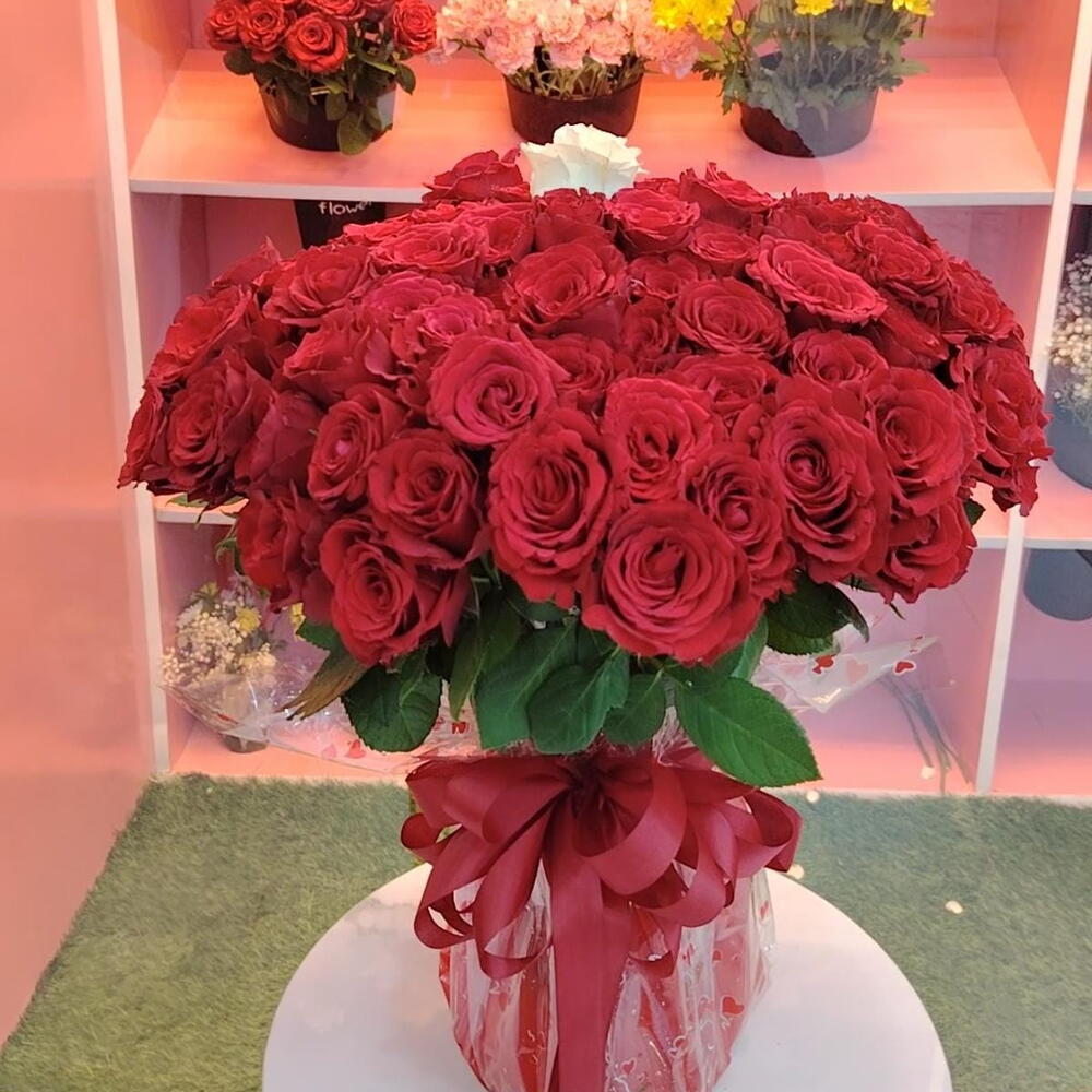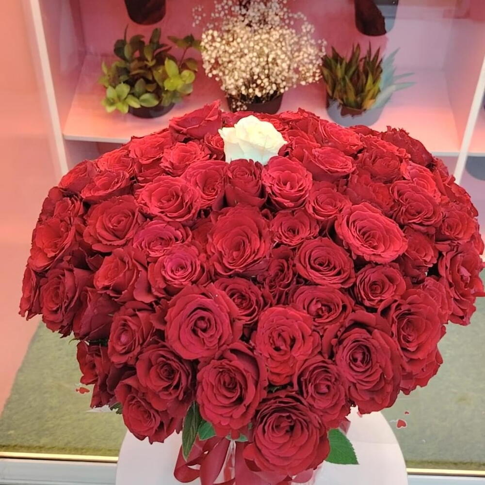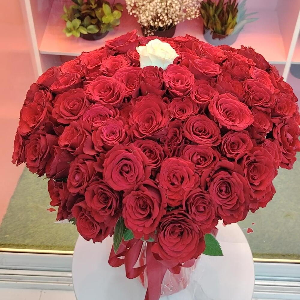 100 красных роз 1 белая роза Красная упаковка Прозрачная упаковка 1 флористическая губка Тканевая красная лента