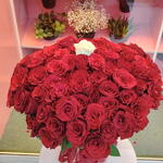 White rose - 1 шт. floral foam - 1 шт. red roses - 100 шт. красная упаковка - 4 шт. прозрачная упаковка - 3 шт. тканевая красная лента - 1 шт.