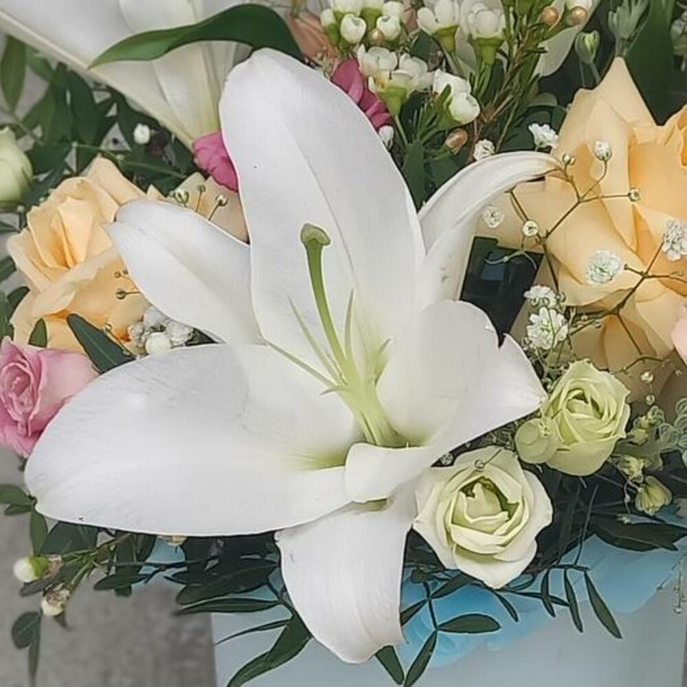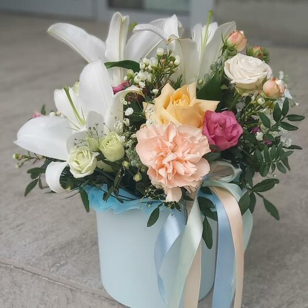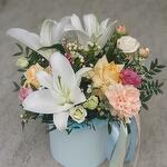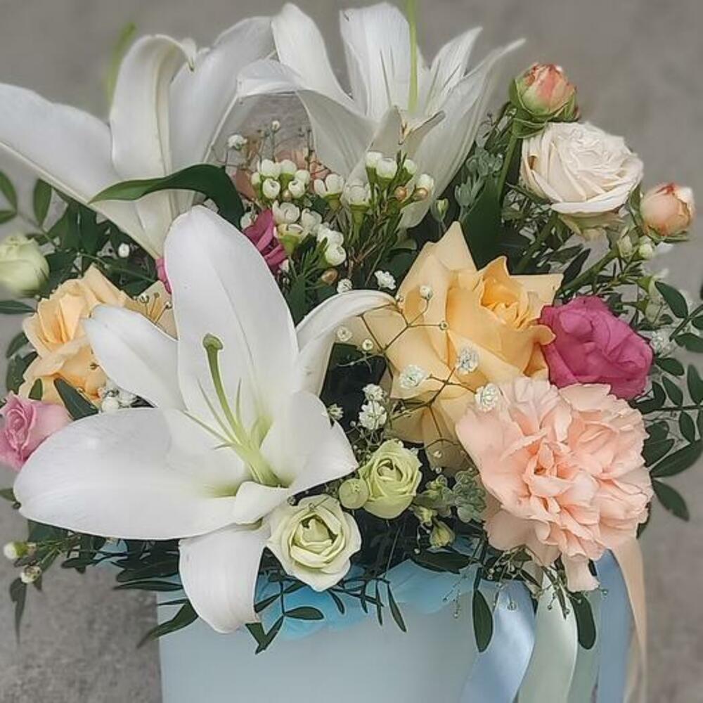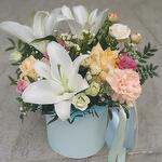 Pistachio - 5 шт. rose - 2 шт. dianthus - 2 шт. white eustoma - 1 шт. шляпная коробка - 1 шт. chamelacium white - 1 шт. white lily - 1 шт. цветочный оазис - 1 шт.
