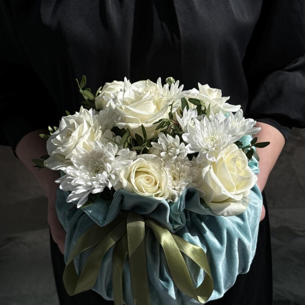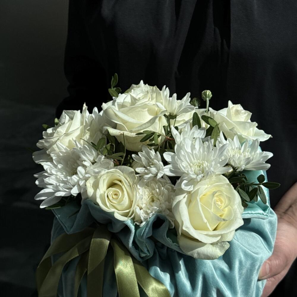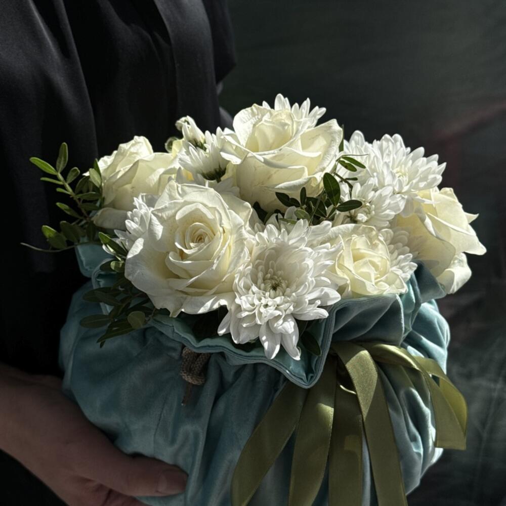 Composition: Rose white - 7, Chrysanthemum spray - 1, Pistacia - 1, Velvet pouch bag - 1 Sizes: WIDTH - 20CM; HEIGHT - 25CM; LENGTH - 25CM; (including packaging) Размер: 20 x 25 x 25 см