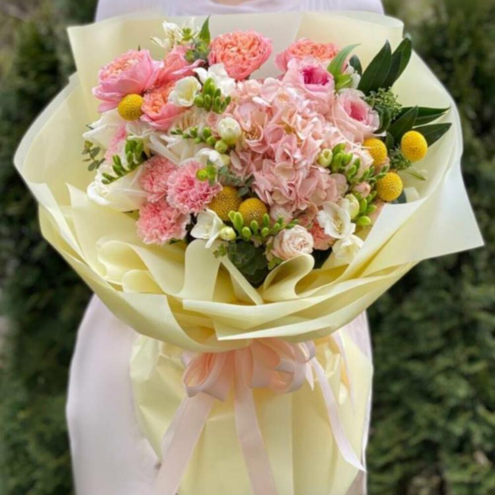 Composition: Hydrangea - 1, Dianthus - 5, Freesia - 5, Rose White Ohara - 3, Spray Rose Julieta peach - 2, Eucalyptus - 1, Craspedia - 6, Skimmia - 1, Rose Pink Ohara - 2, Rose sprey Madame Bombastic - 2, wrapping - 7, ribbon - 1 Sizes: WIDTH - 50CM; HEIGHT - 60CM; LENGTH - 60CM; (including packaging) Размер: 50 x 60 x 60 см