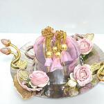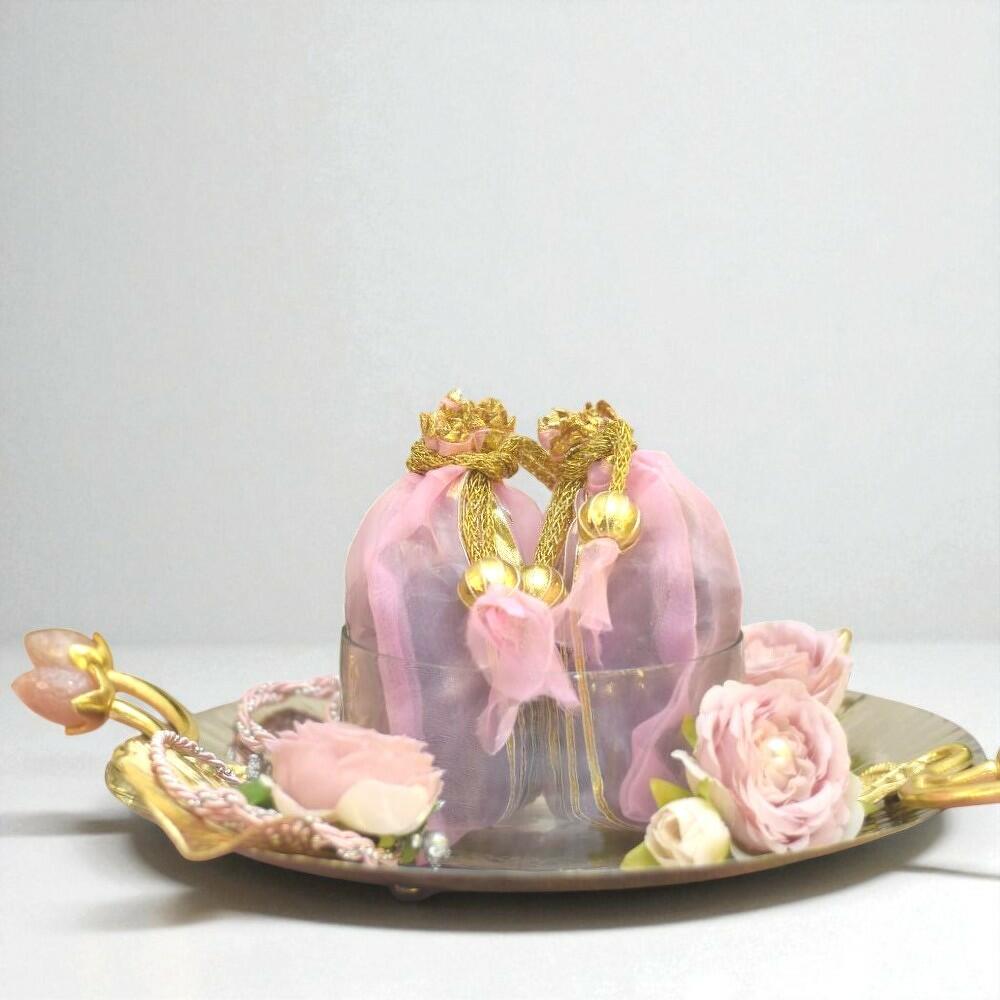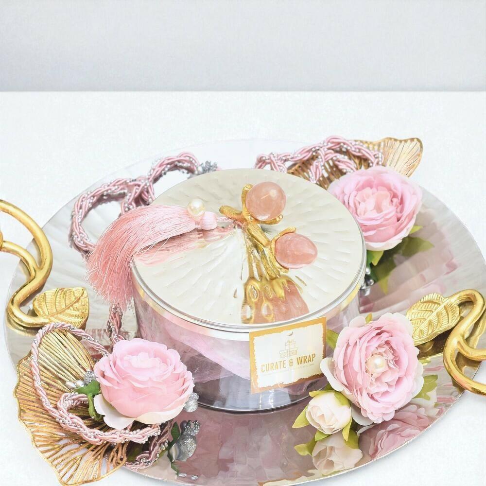 Эта элегантная цветочная композиция – настоящее произведение искусства, сочетающее в себе мягкие пастельные тона и роскошные золотые детали. Круглый серебряный поднос украшен нежными розовыми розами и бутонами, дополненными золотыми листьями и изысканным жгутом, создающим изысканный эффект. В центре композиции – шикарная круглая коробочка с кисточкой и украшениями в виде драгоценных камней, идеально подходящая для подарка или в качестве декоративных элементов. Сочетание нежно-розовых тонов и металлических акцентов создает изысканный, но в то же время романтичный образ. Эта композиция станет идеальным подарком на свадьбу, помолвку или любое другое торжество, требующее элегантности и стиля. Чтобы композиция выглядела свежей и красивой, просто удалите пыль с цветов и аккуратно протрите металлические детали мягкой тканью. Избегайте прямых солнечных лучей и чрезмерной влажности, чтобы сохранить нежную текстуру и цвет. Состав: 1. Миндаль в шоколадной глазури (потли): миндаль, молочный шоколад 2. Соленые фисташки (потли): фисташки, соль Аллергены: миндаль, фисташки