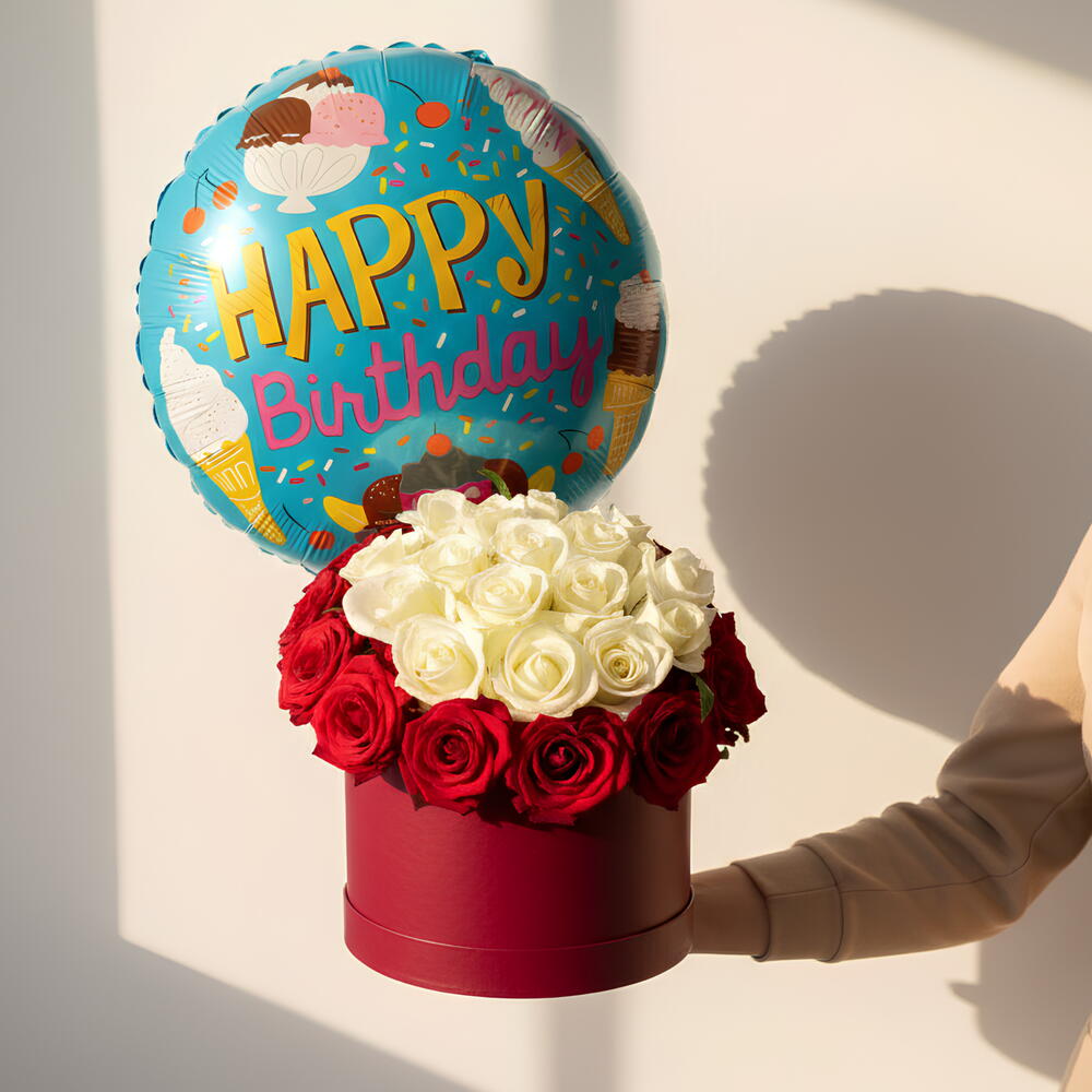 Red rose - 13 шт. White rose - 15 шт. balloon - 3 шт. шляпная коробка - 1 шт.