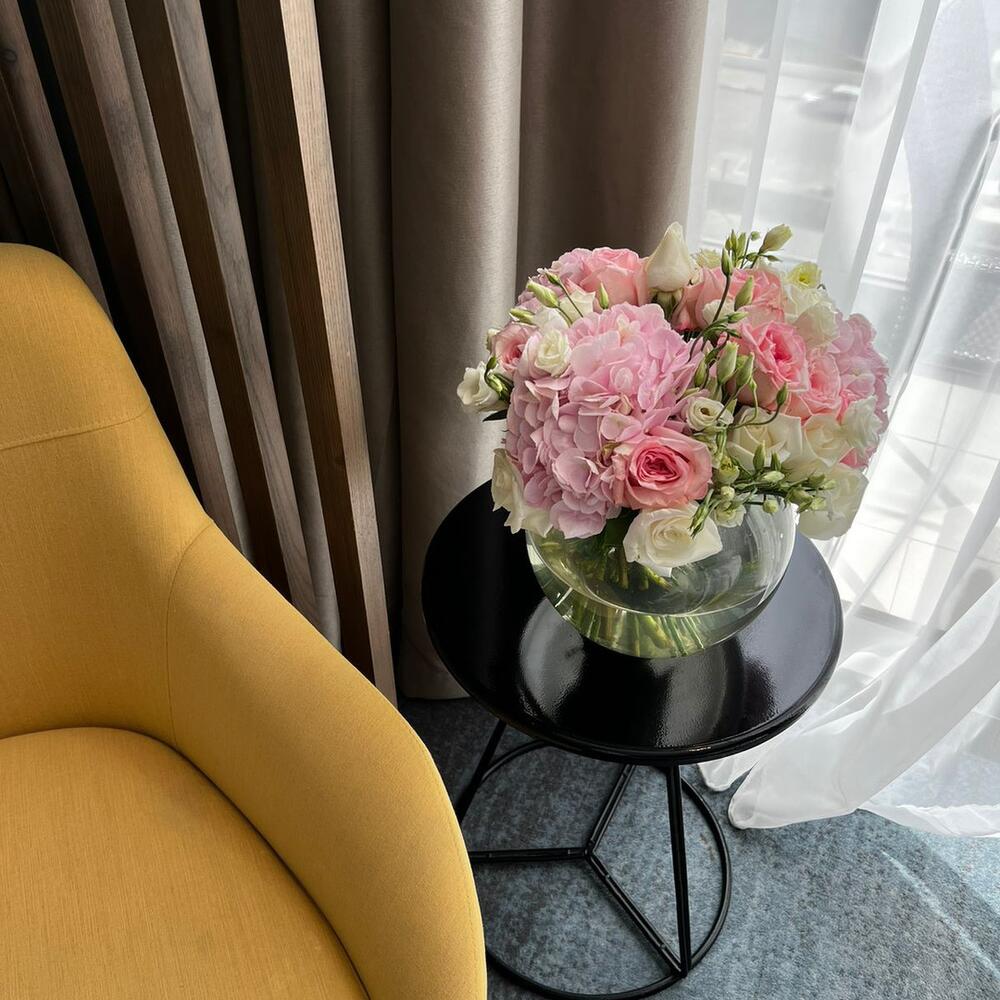 hydrangea pink - 1 шт. glass vase - 1 шт. premium ohara rose - 10 шт. lusianthus white - 1 шт.