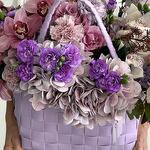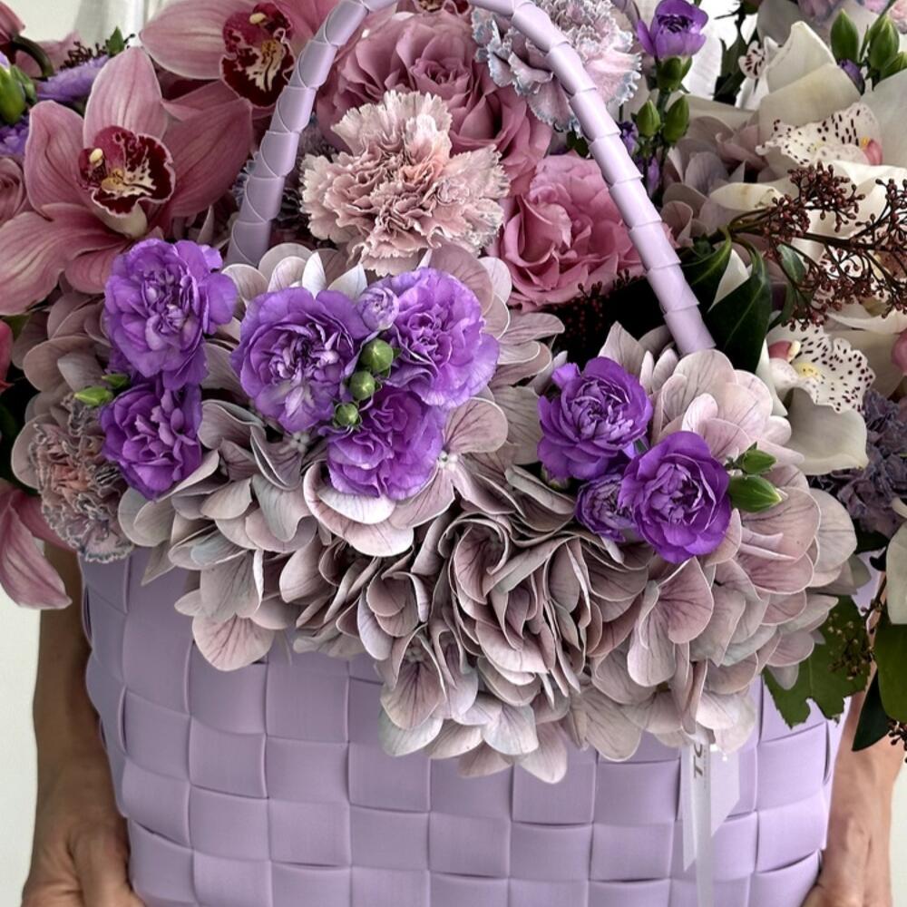 Composition: Hydrangea - 4, Skimmia - 4, Dianthus spray - 6, rose lilac - 6, Cymbidium - 15, Dianthus Space Dyed - 10, oasis - 1, bag - 1 Sizes: WIDTH - 60CM; HEIGHT - 60CM; LENGTH - 60CM; (including packaging) Размер: 60 x 60 x 60 см
