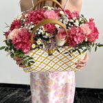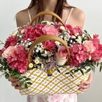 Composition: preserved Hydrangea - 0.5, Gypsophila - 2, Chrysanthemum - 5, Jumilia rose - 4, limonium - 2, Pistacia - 2, bag - 1, Oasis - 1 Sizes: WIDTH - 35CM; HEIGHT - 45CM; LENGTH - 45CM; (including packaging) Размер: 35 x 45 x 45 см