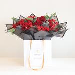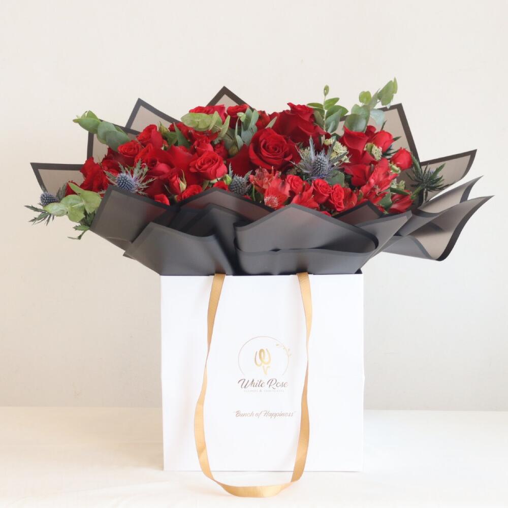 Букет со смесью красных роз, кустовых роз, альстромерий и других наполнителей