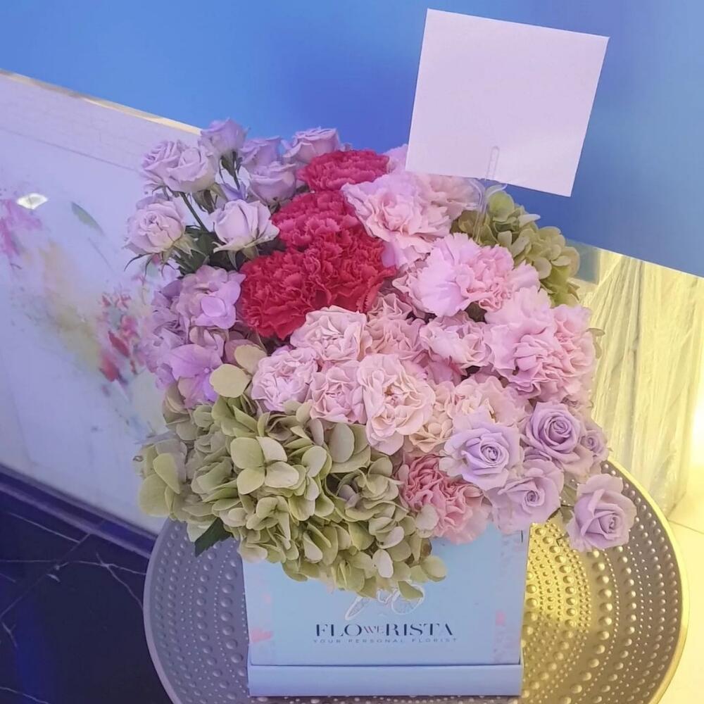 Цветочная композиция в коробке. Дизайн включает 2 премиальные гортензии зелёного цвета 10 стеблей розовых и тёмно-розовых гвоздик 5 стеблей розовых мини-роз Оформлена в декоративную брендированную коробку