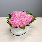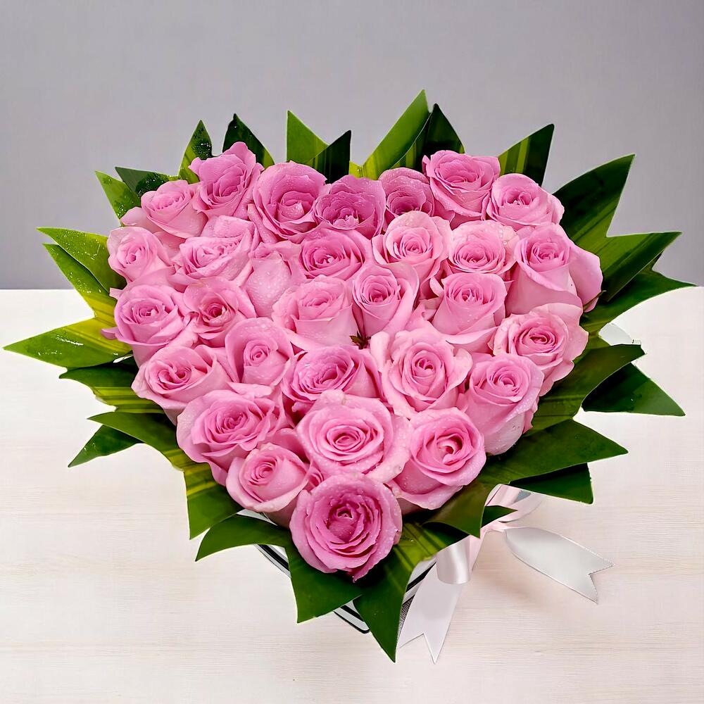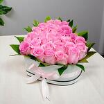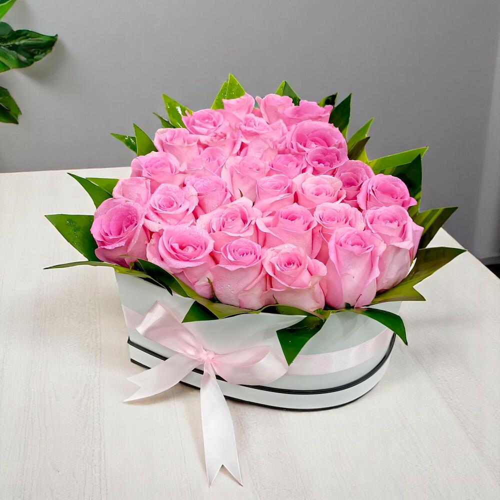 Нежная композиция из 30 розовых роз, элегантно оформленная в белой коробке, создающая очаровательную и романтичную цветочную композицию.
