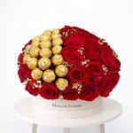 Незабываемый роскошный подарок, сочетающий элегантность 31 премиальной красной розы с изысканностью 25 кусочков шоколада. Выполненная в пышном, округлом стиле, сочетающем романтику и утонченность, эта композиция идеально подойдет для годовщин, дней рождения, торжеств или любого момента, заслуживающего нотки великолепия. Поразительное сочетание насыщенно-красных цветов и золотистого шоколада создает потрясающую, запоминающуюся презентацию.