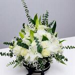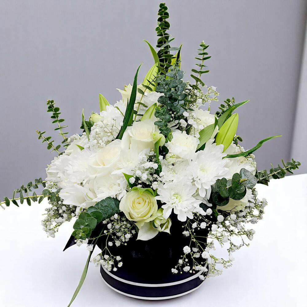 Chrysanthemum - 4 шт. Lily - 5 шт. White rose - 20 шт. Gypsophila - 10 шт. carnation - 12 шт. эвкалипт - 10 шт. эустома - 5 шт.