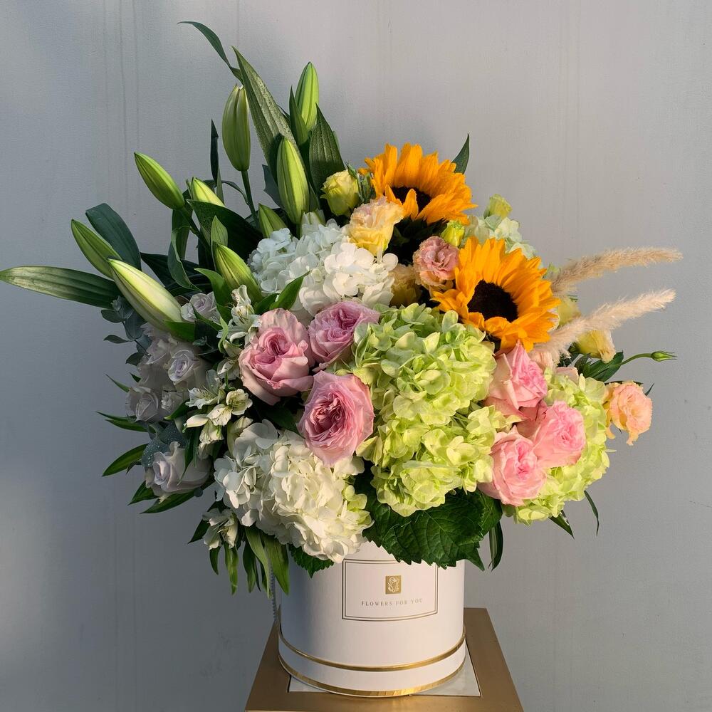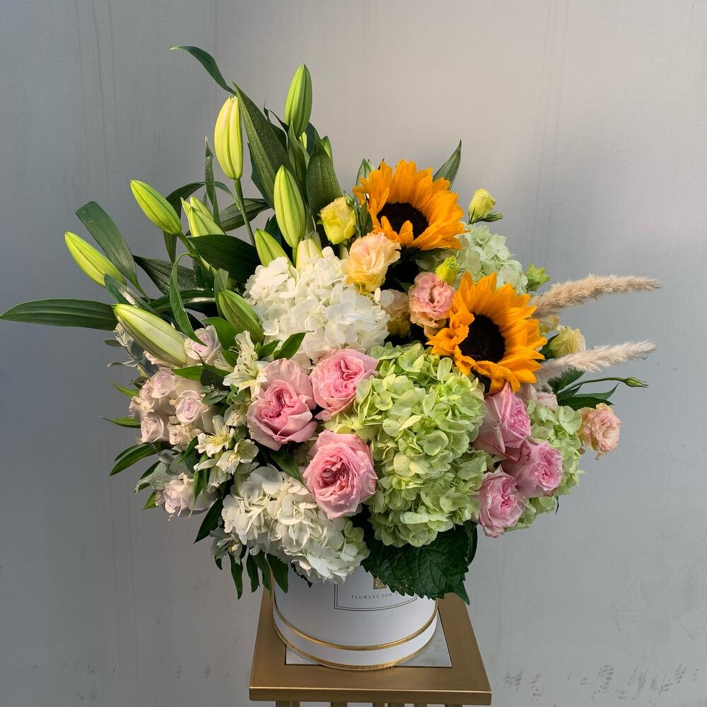 Spray rose - 2 шт. Hydrangea - 5 шт. Lily - 5 шт. Sunflower - 2 шт. Pink rose - 12 шт. сухой цветок - 2 шт. estoma цветок - 2 шт. листья джамаки - 2 шт.