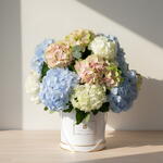 Ощутите очарование любви с нашей коробкой «Расцветающая любовь», в которой представлено завораживающее сочетание из 7 стеблей безупречно белых гортензий, 7 стеблей освежающе-зелёных гортензий и 6 стеблей элегантных голубых гортензий. Поднимите свои чувства благодаря изысканной красоте гортензий, аккуратно расположенных в очаровательной коробке.