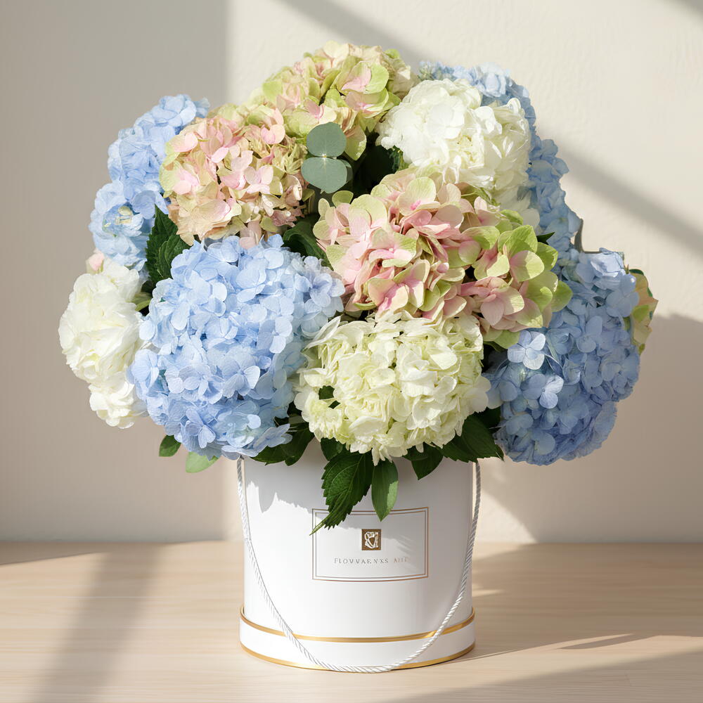Ощутите очарование любви с нашей коробкой «Расцветающая любовь», в которой представлено завораживающее сочетание из 7 стеблей безупречно белых гортензий, 7 стеблей освежающе-зелёных гортензий и 6 стеблей элегантных голубых гортензий. Поднимите свои чувства благодаря изысканной красоте гортензий, аккуратно расположенных в очаровательной коробке.