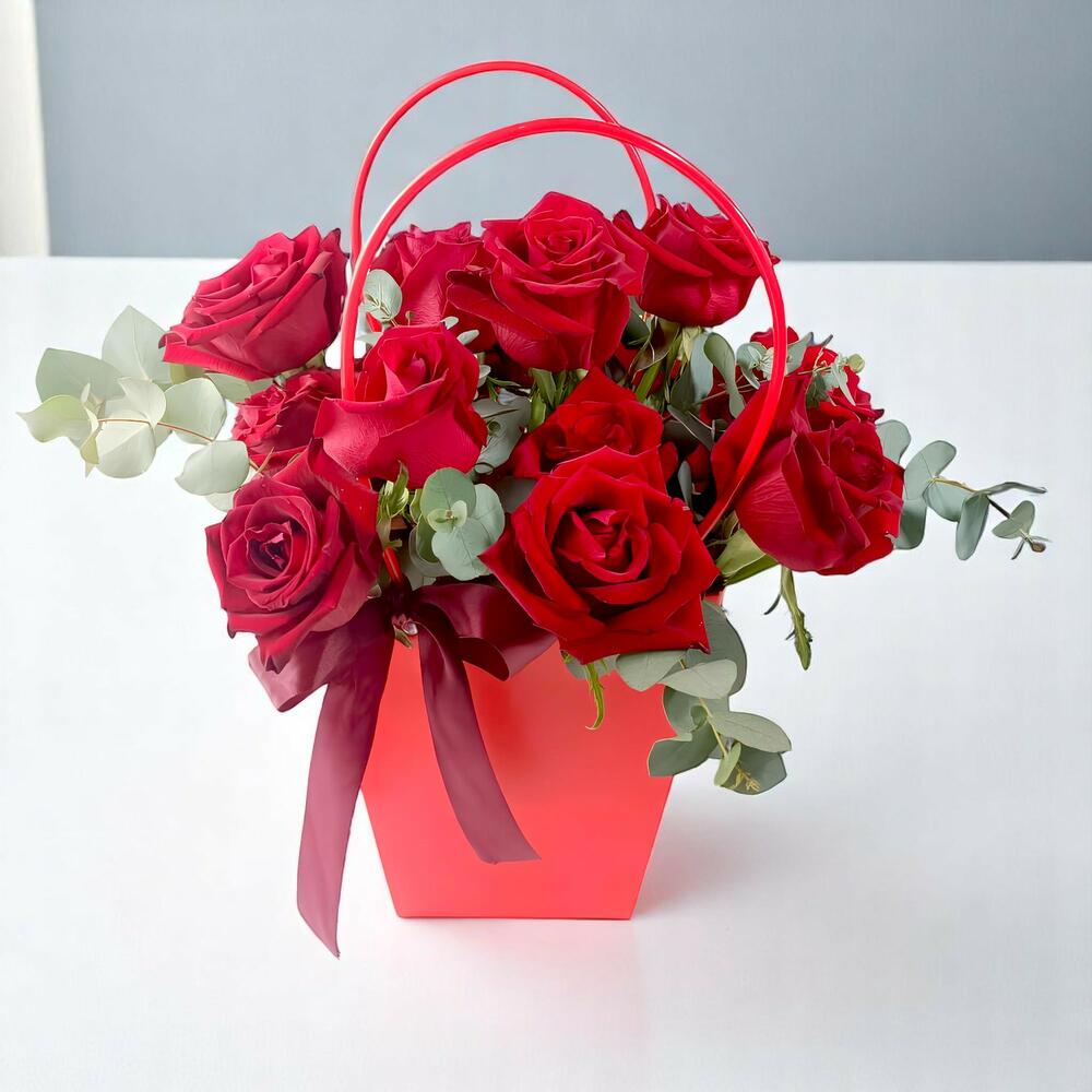 Композиция из красных роз в цветочной сумке