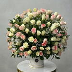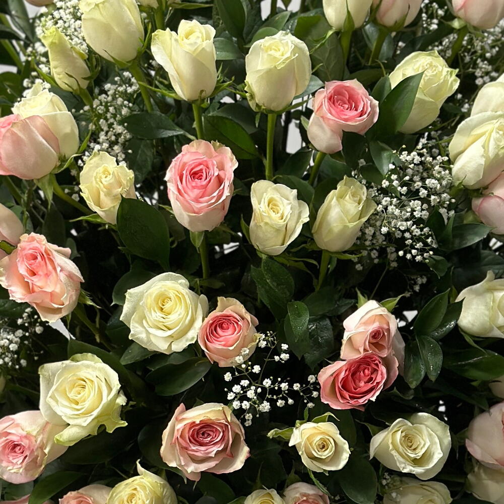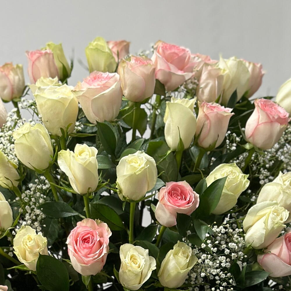 Box - 1 шт. Pink rose - 51 шт. White rose - 50 шт. Gypsophila - 10 шт.