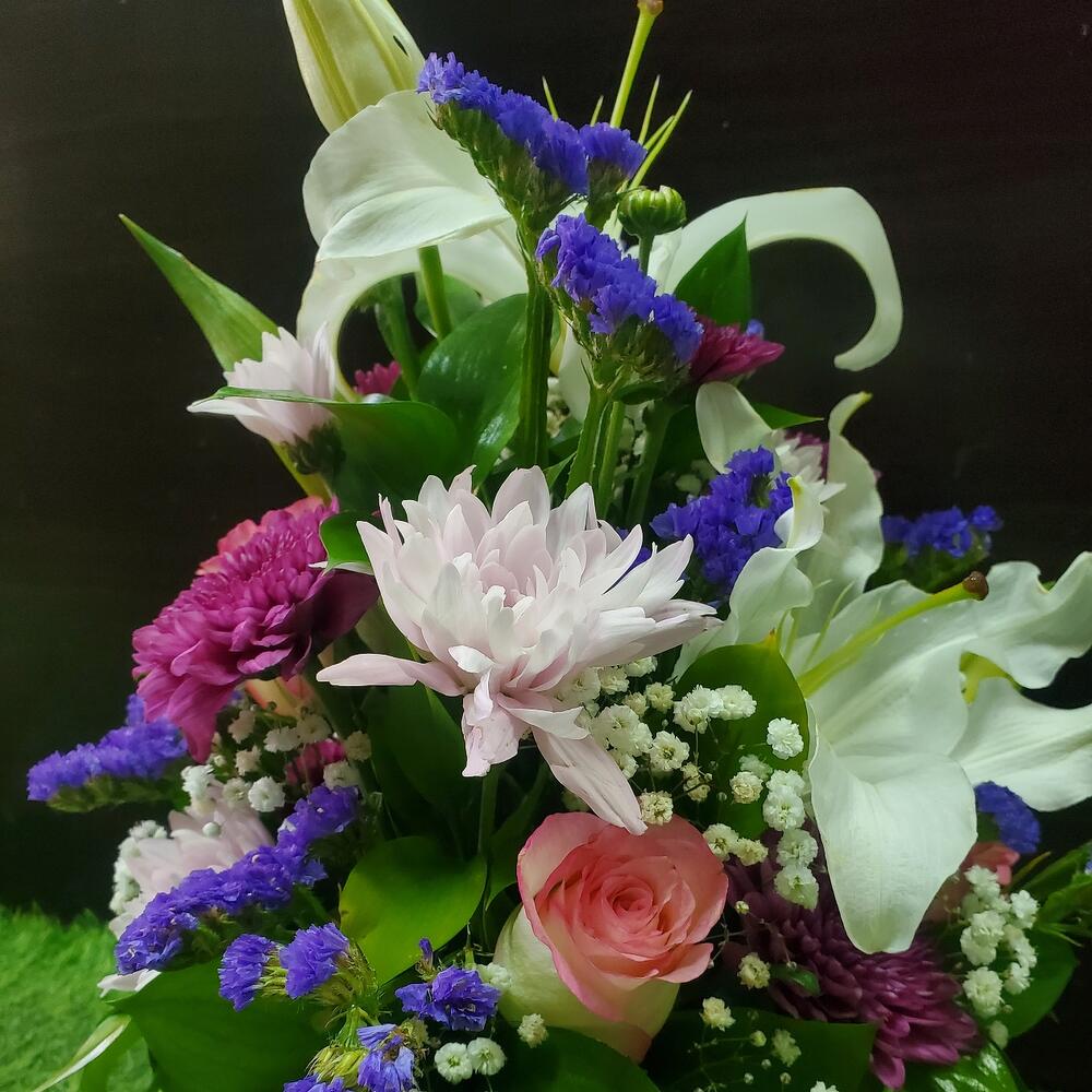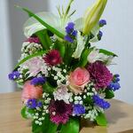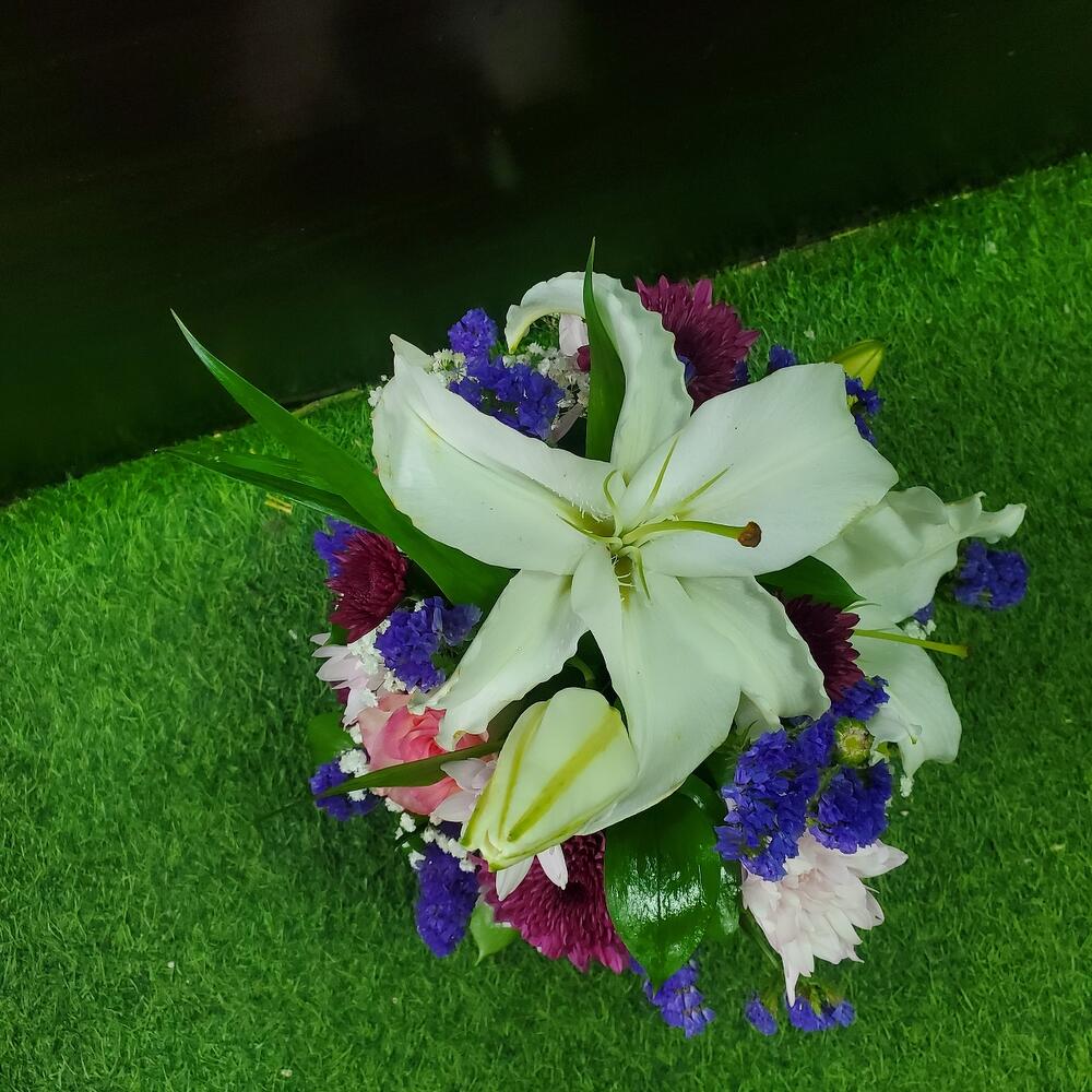 Limonium - 6 шт. Pink rose - 5 шт. chrysanthemum single - 14 шт. lily white - 1 шт. ruscus israel - 5 шт.
