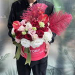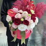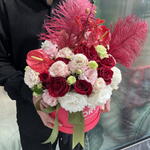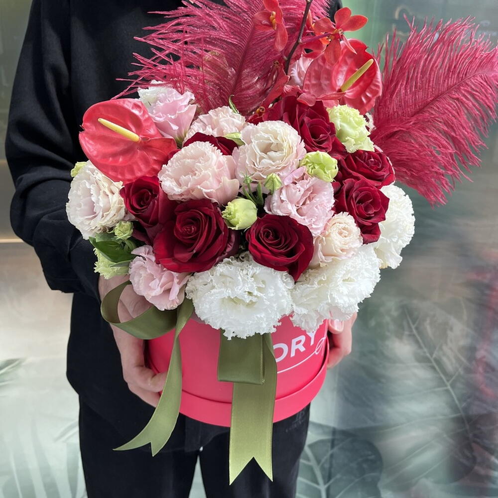 Composition: Rose red - 10, Lisianthus - 5, Anthurium (Terrasol) - 2, Vanda - 1, Dianthus mix - 5, box - 1 Sizes: WIDTH - 25CM; HEIGHT - 25CM; LENGTH - 25CM; (including packaging) Размер: 25 x 25 x 25 см