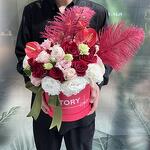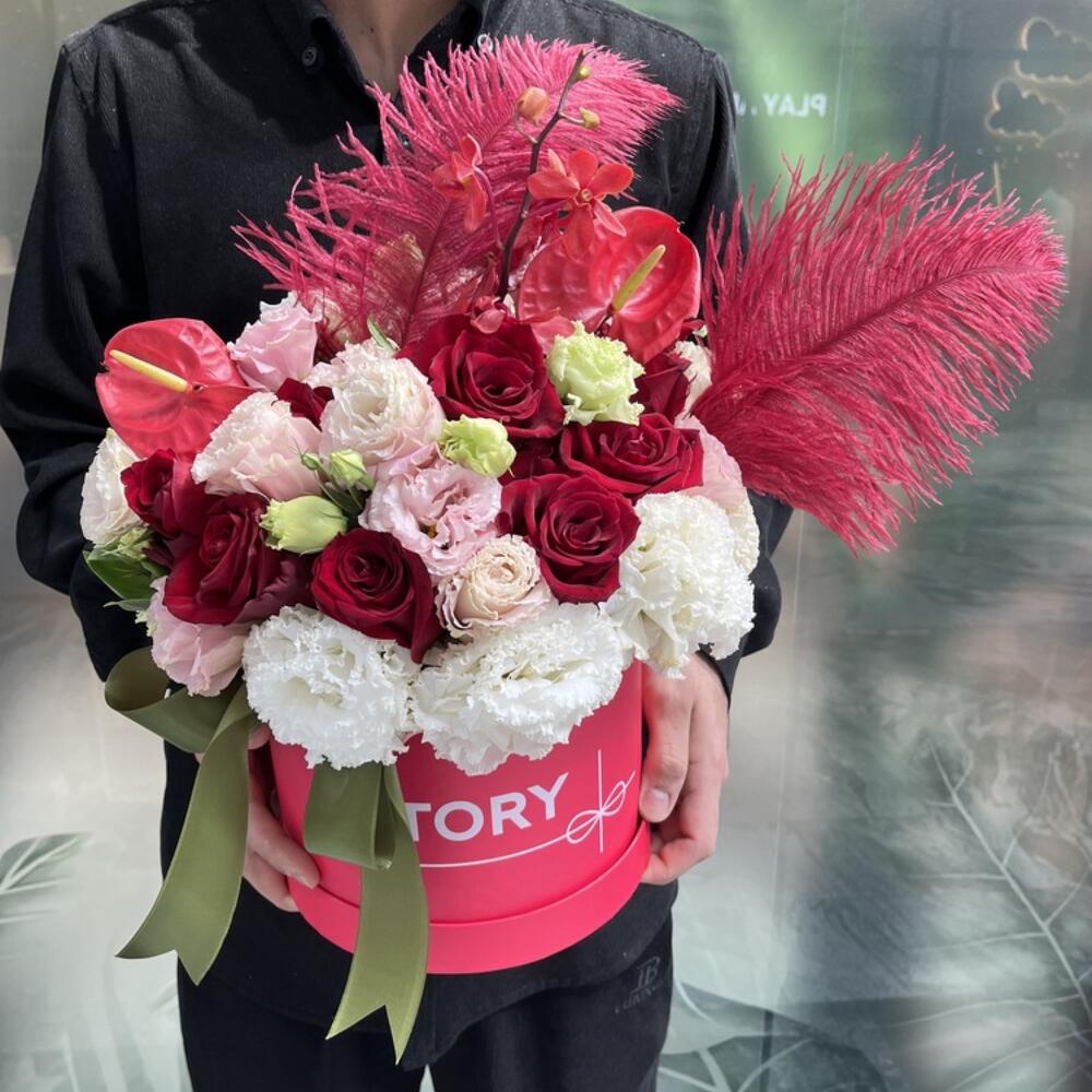 Composition: Rose red - 10, Lisianthus - 5, Anthurium (Terrasol) - 2, Vanda - 1, Dianthus mix - 5, box - 1 Sizes: WIDTH - 25CM; HEIGHT - 25CM; LENGTH - 25CM; (including packaging)