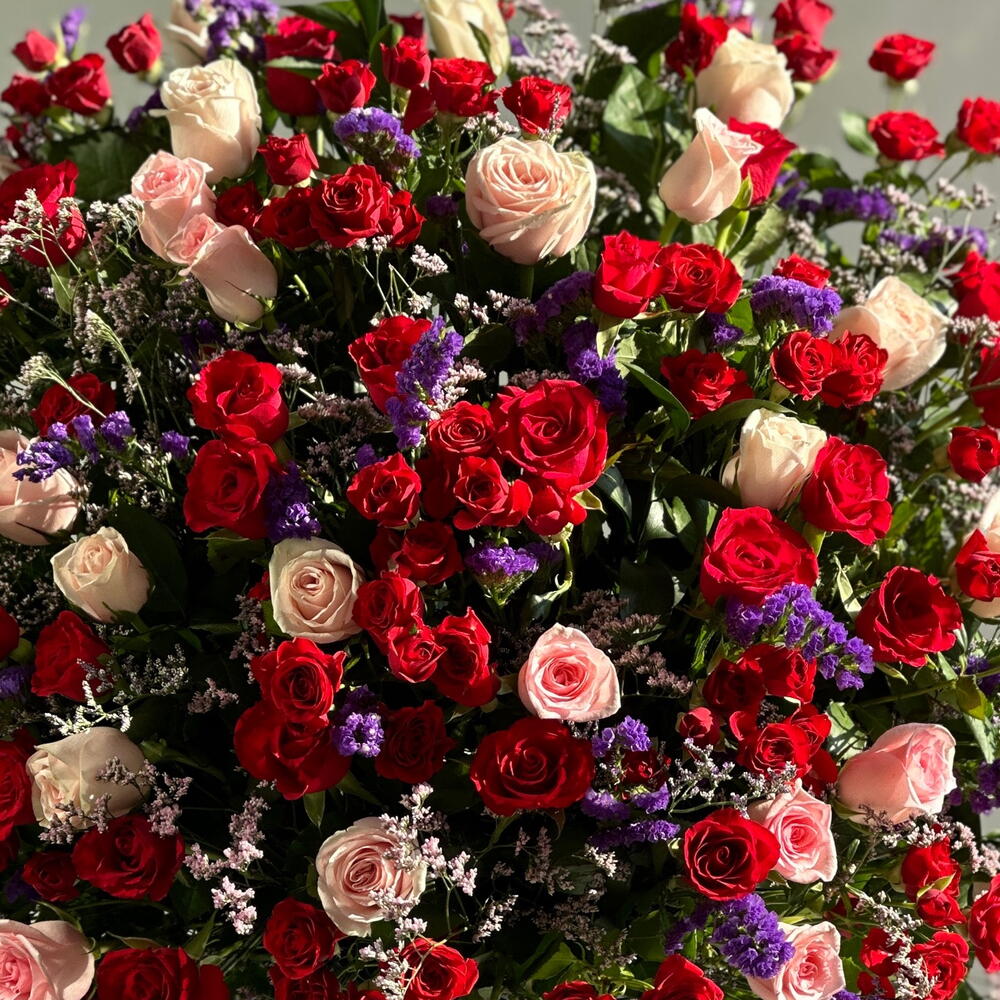 Red rose - 31 шт. Statice - 20 шт. Box - 1 шт. Pink rose - 30 шт. red spray rose - 20 шт. зелень - 10 шт.