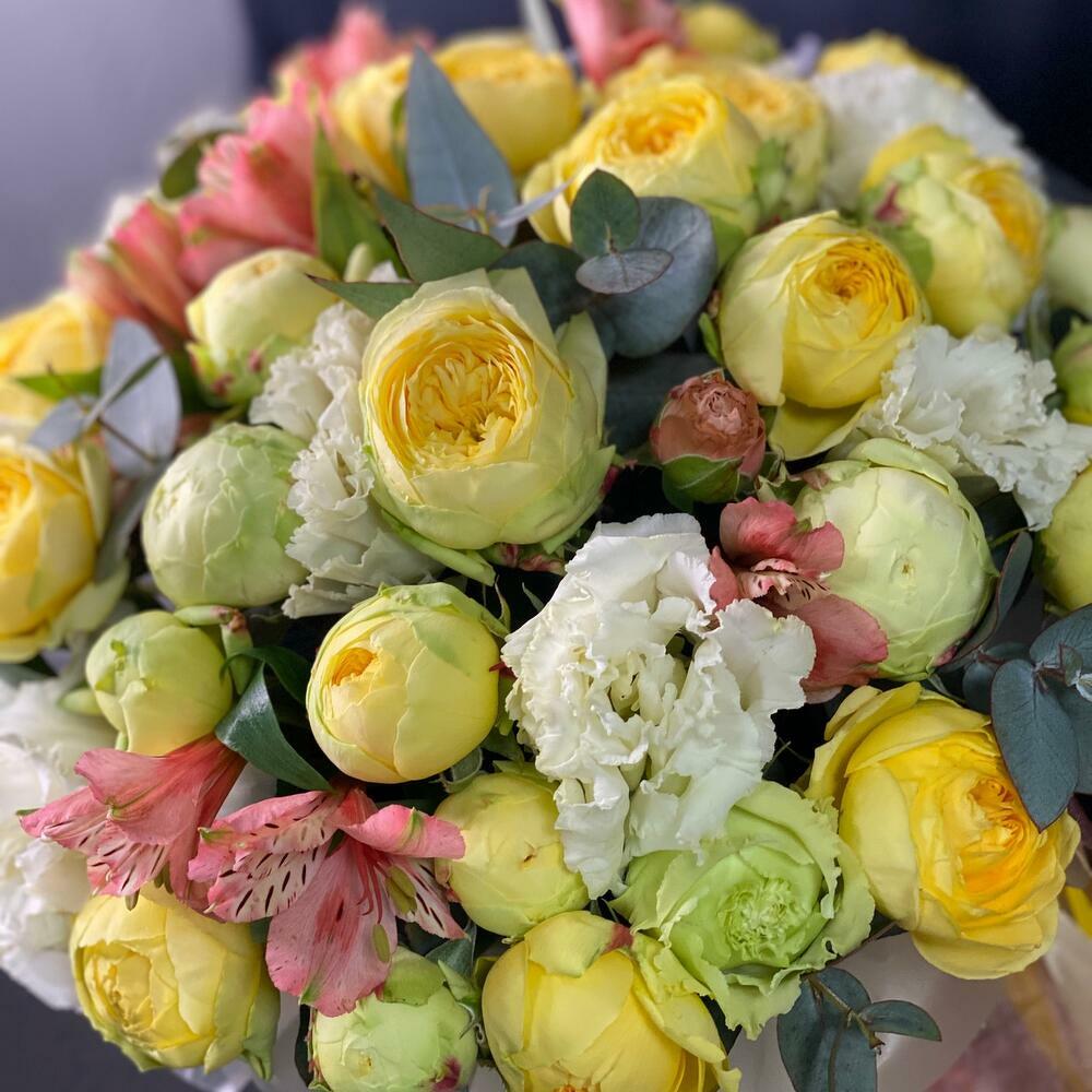 Satin ribbon - 2 шт. Eucalyptus - 10 шт. Alstroemeria - 3 шт. Lisianthus - 3 шт. прозрачная упаковка - 1 шт. белая цветочная коробка - 1 шт. пионовидные розы золотые трансеттер - 7 шт.