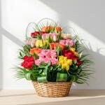Корзина «Фестиваль роз» — яркая и роскошная композиция, наполненная цветом и жизнью. В ней использована щедрая смесь красных, розовых, жёлтых, оранжевых и кремовых роз, создающая впечатляющий многослойный эффект, полный тепла и праздничного настроения. Пышная зелень и изящные травяные акценты придают композиции динамику и объём, красиво оформленные в классической плетёной корзине.
