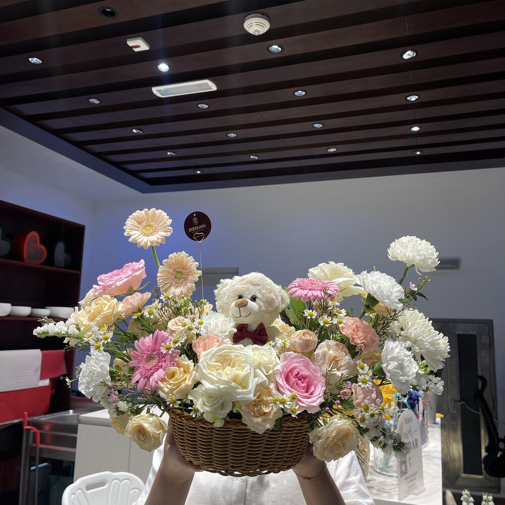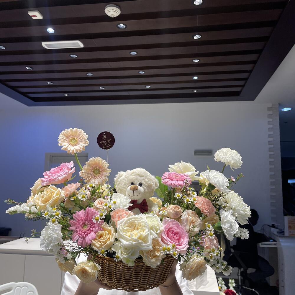 Эта притягательная цветочная корзина хранит в себе гораздо больше, чем просто цветы. Созданная, чтобы выразить сладость ваших чувств, она содержит милого плюшевого медвежонка, уютно устроенного среди пышной композиции из 4 изысканных роз, которые символизируют любовь и страсть. В сопровождении с ними — 4 потрясающие гвоздики, известные своим глубоким символизмом и ассоциацией с восхищением, не говоря уже о 10 очаровательных мини-розах, символизирующих невинность и новые начинания. Идеальный подарок, чтобы передать ваши чувства без слов.