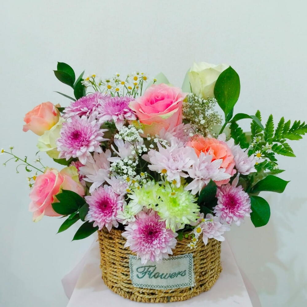 Наполненная несравненной грацией и цветом, эта великолепная цветочная корзина украшена четырьмя нежными розовыми розами, шестью потрясающими хризантемами «Малибу», шестью жизнерадостными розовыми хризантемами и тремя безупречными белыми розами. Композиция дополнена очаровательной невинностью десяти ромашек, яркой зеленью шести листьев и эфирным прикосновением пяти веточек гипсофилы. Эта прекрасная смесь цветов наверняка обрадует и станет привлекательным центральным украшением или продуманным подарком.
