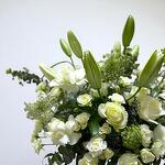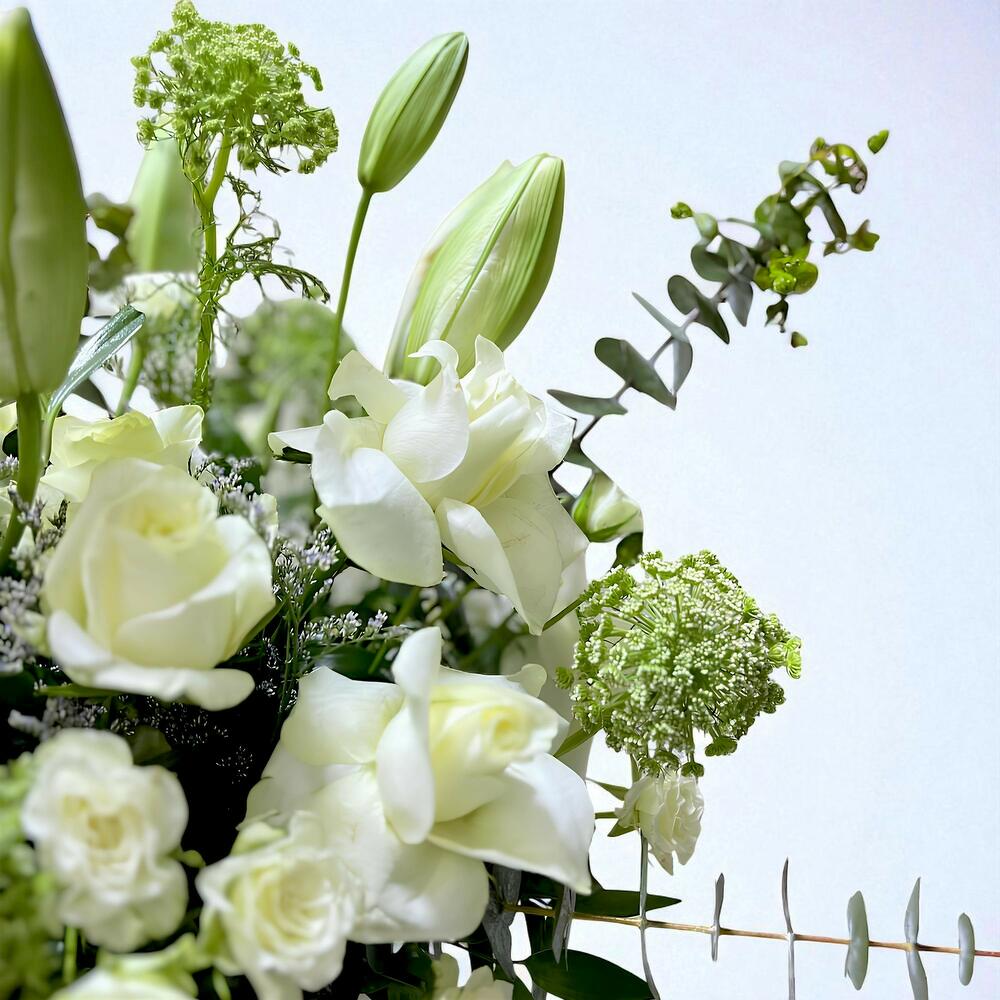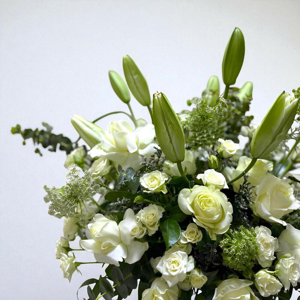 Lily - 3 шт. White rose - 15 шт. ammi - 10 шт. eukalyptus - 5 шт. маленькая роза - 10 шт. square box - 1 шт.