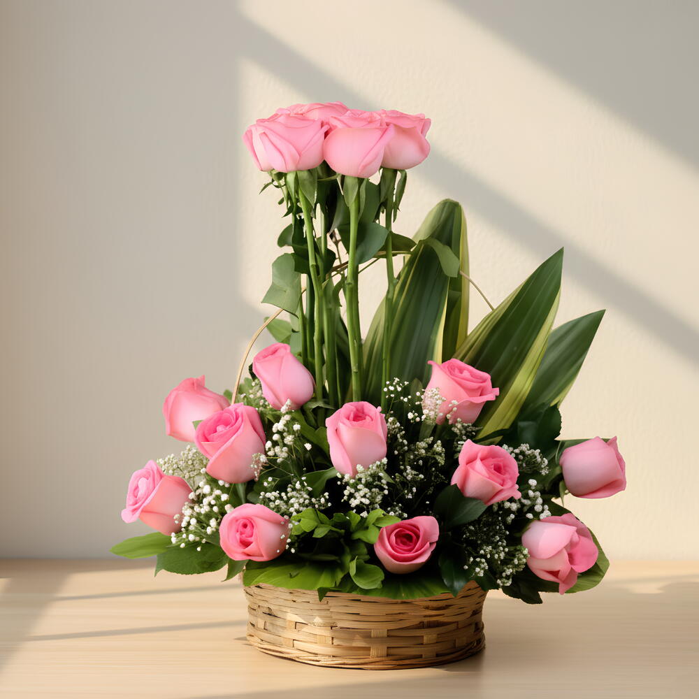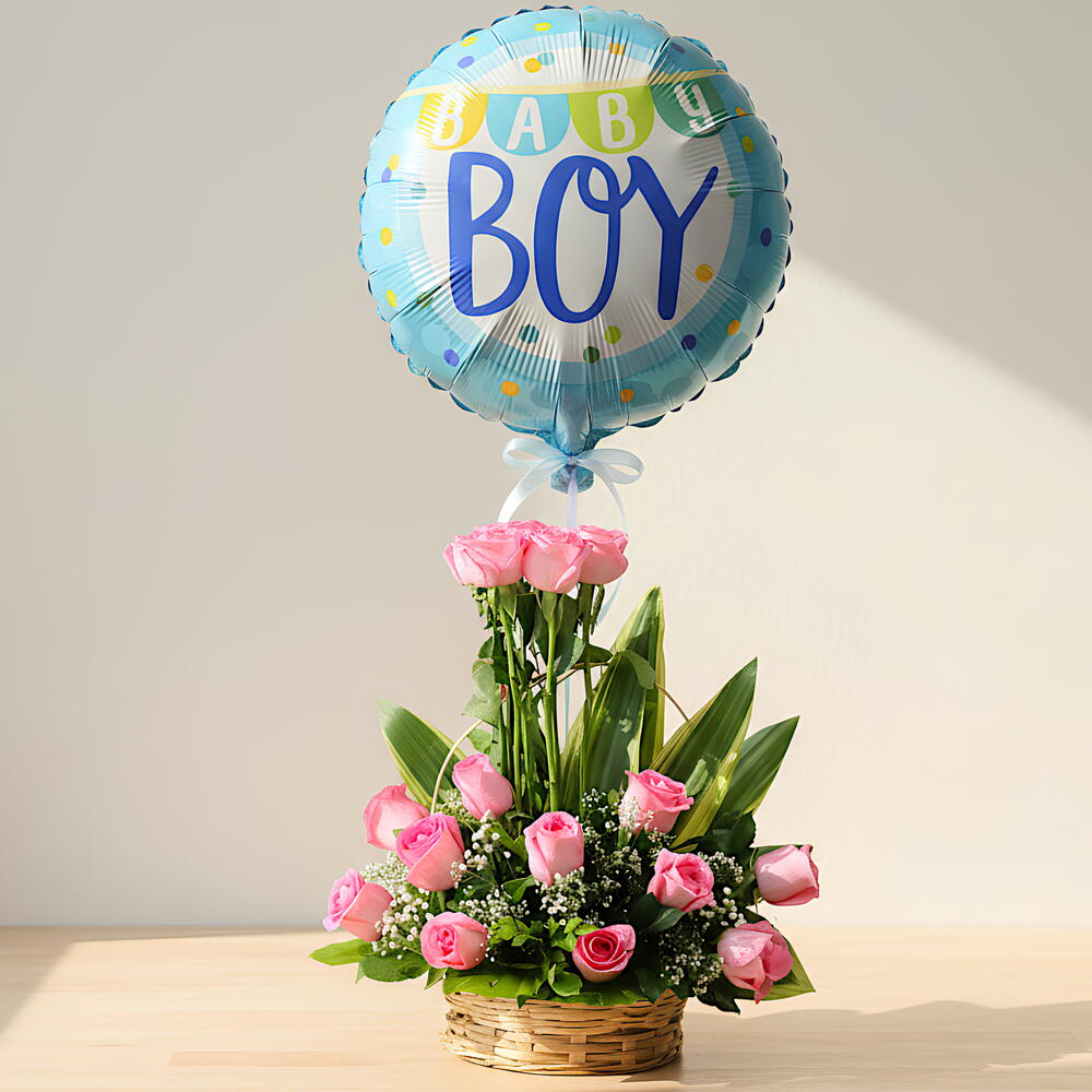 Празднуйте радостное появление прекрасного маленького мальчика с праздничной корзиной «Добро пожаловать, маленький принц». Этот очаровательный дизайн сочетает нежные розовые розы и пышную зелень, размещённые в натуральной плетёной корзине и увенчанные весёлым голубым шаром с надписью «Мальчик». Вертикальная деталь из роз придаёт высоту и изящество, а нежные пастельные тона создают тёплую и трогающую композицию — идеально подходит для доставки в роддом, празднования в честь малыша или встречи мамы с малышом дома. Сладкая, стильная и полная любви — продуманный способ сказать «Поздравляем с вашим маленьким чудом.» 💙
