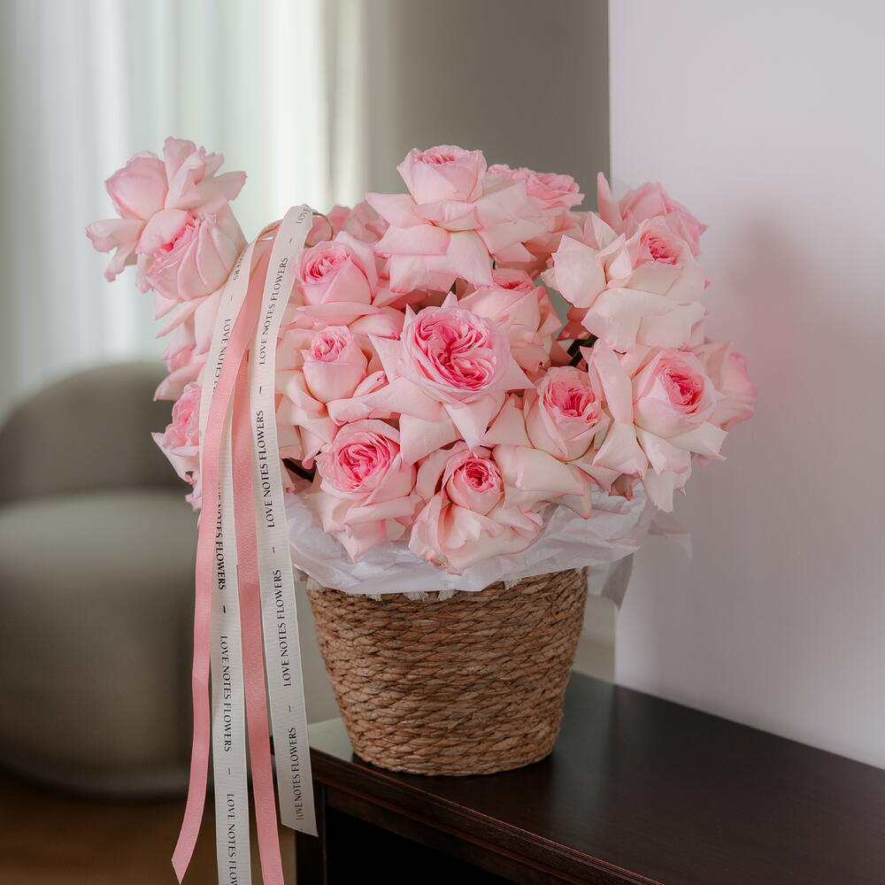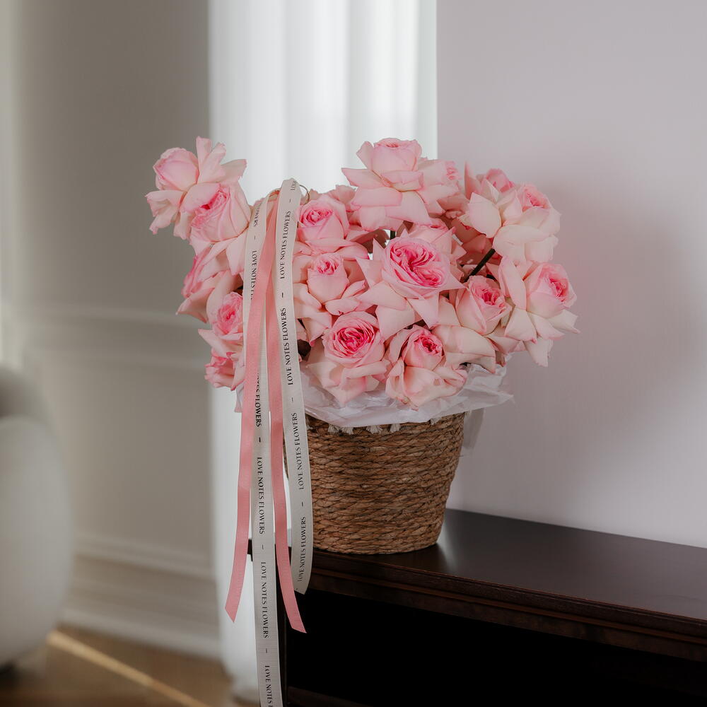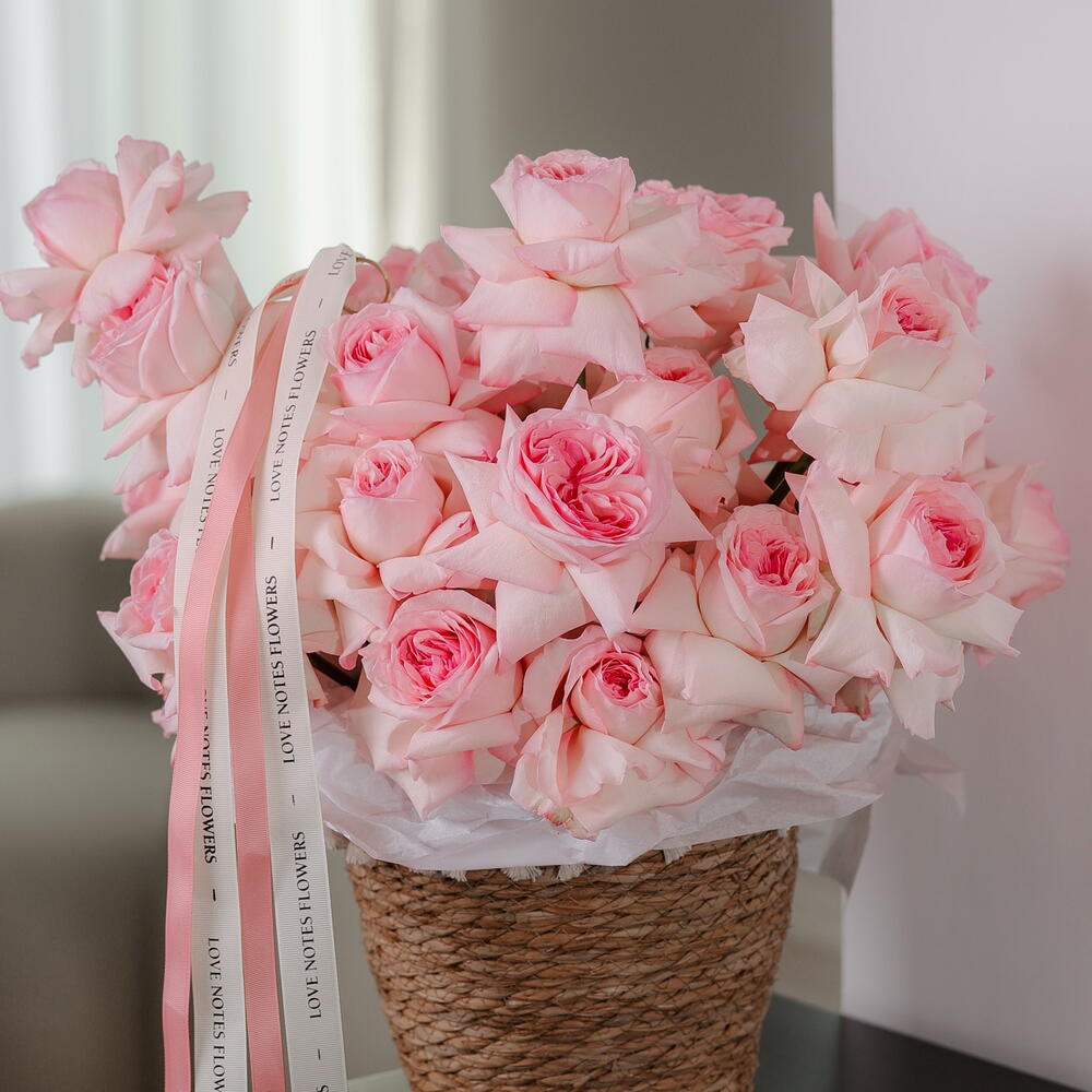 Передайте сущность грации и элегантности с помощью нашей элегантно оформленной корзины из 30 роз Охара розового цвета. Идеальный выбор для моментов, которые хочется беречь и помнить.