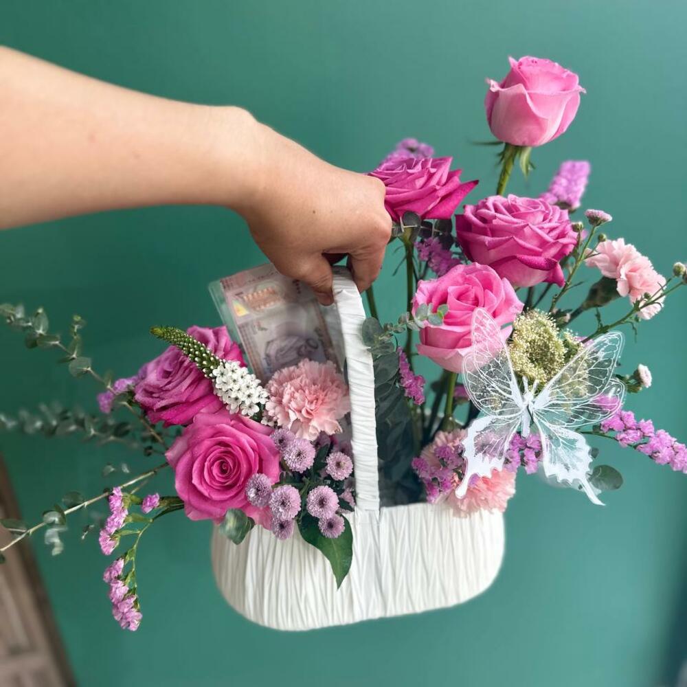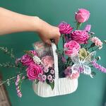 Эта изысканная композиция «Цветы в корзине» искусно создана, чтобы передать ощущение элегантности и очарования. Она включает в себя три зелёных листа эвкалипта, две яркие гвоздики, одну цветущую кустовую хризантему, четыре романтичные розы и один очаровательный элемент статики. Композиция украшена элементами из гипсона и упакована в мини-корзинку. Идеально подходит в качестве подарка, центрального элемента декора или украшения интерьера, позволяя легко привнести частичку природной красоты и изысканности в любое пространство.