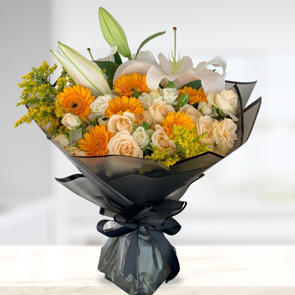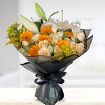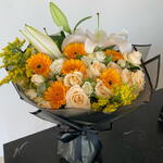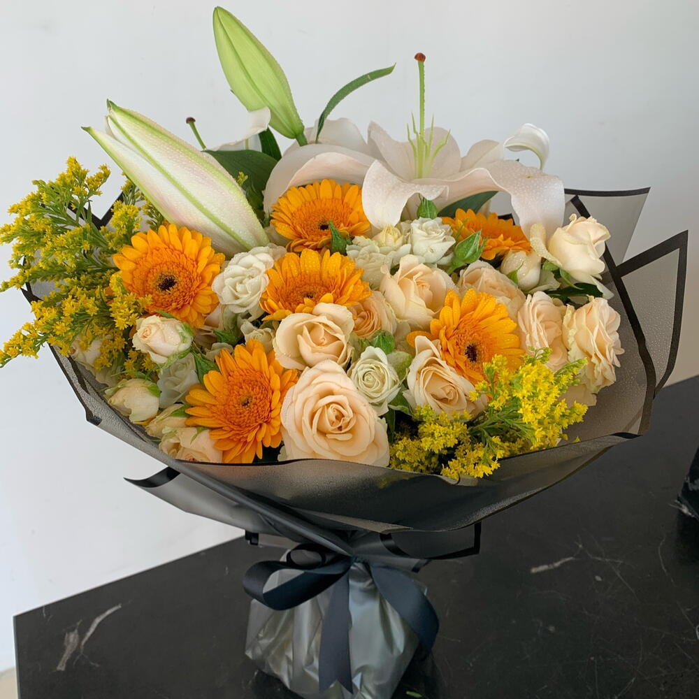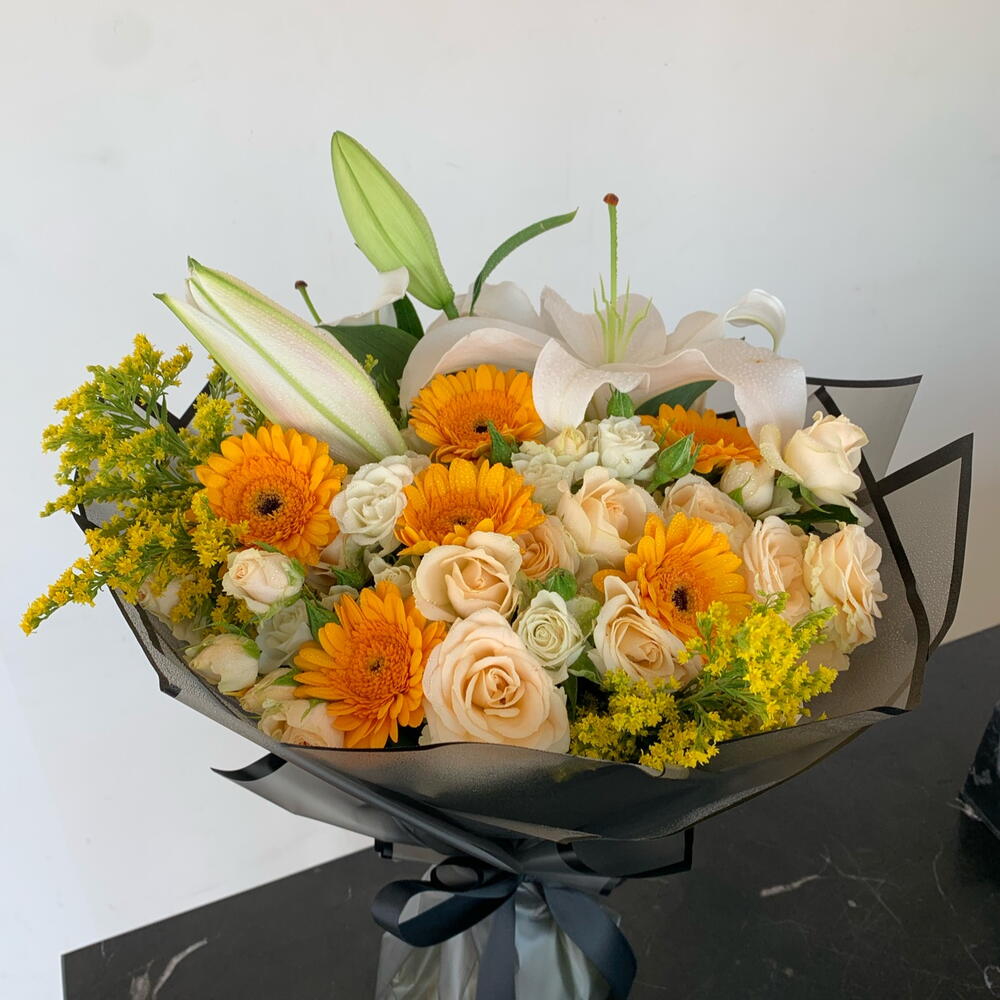 Lily - 2 шт. gerbera mini - 6 шт. salidago - 2 шт. персиковая мини-роза - 5 шт.