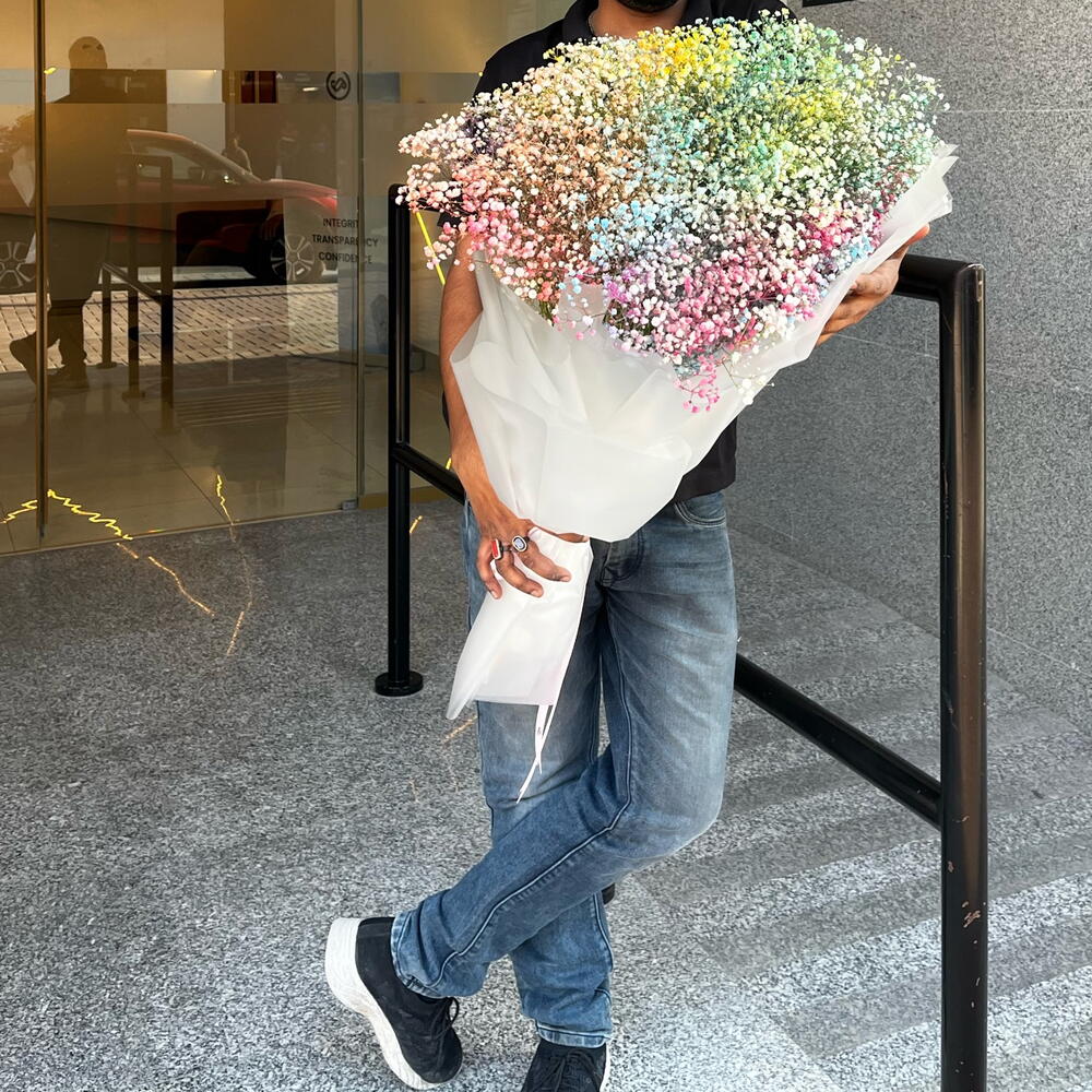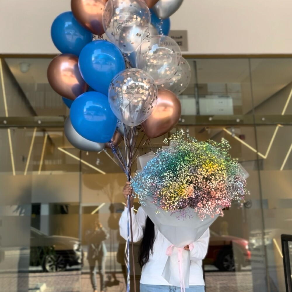 окрашенная гипсофила - 20 шт. воздушные шары цвета розового золота - 7 шт. синие воздушные шары - 7 шт. шар с конфетти - 5 шт.
