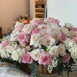 lucianthus white - 20 шт. mathiola white - 20 шт. ohara white and pink - 50 шт. big basket - 1 шт. peach and white baby rose - 50 шт. cut peach orchids - 3 шт.