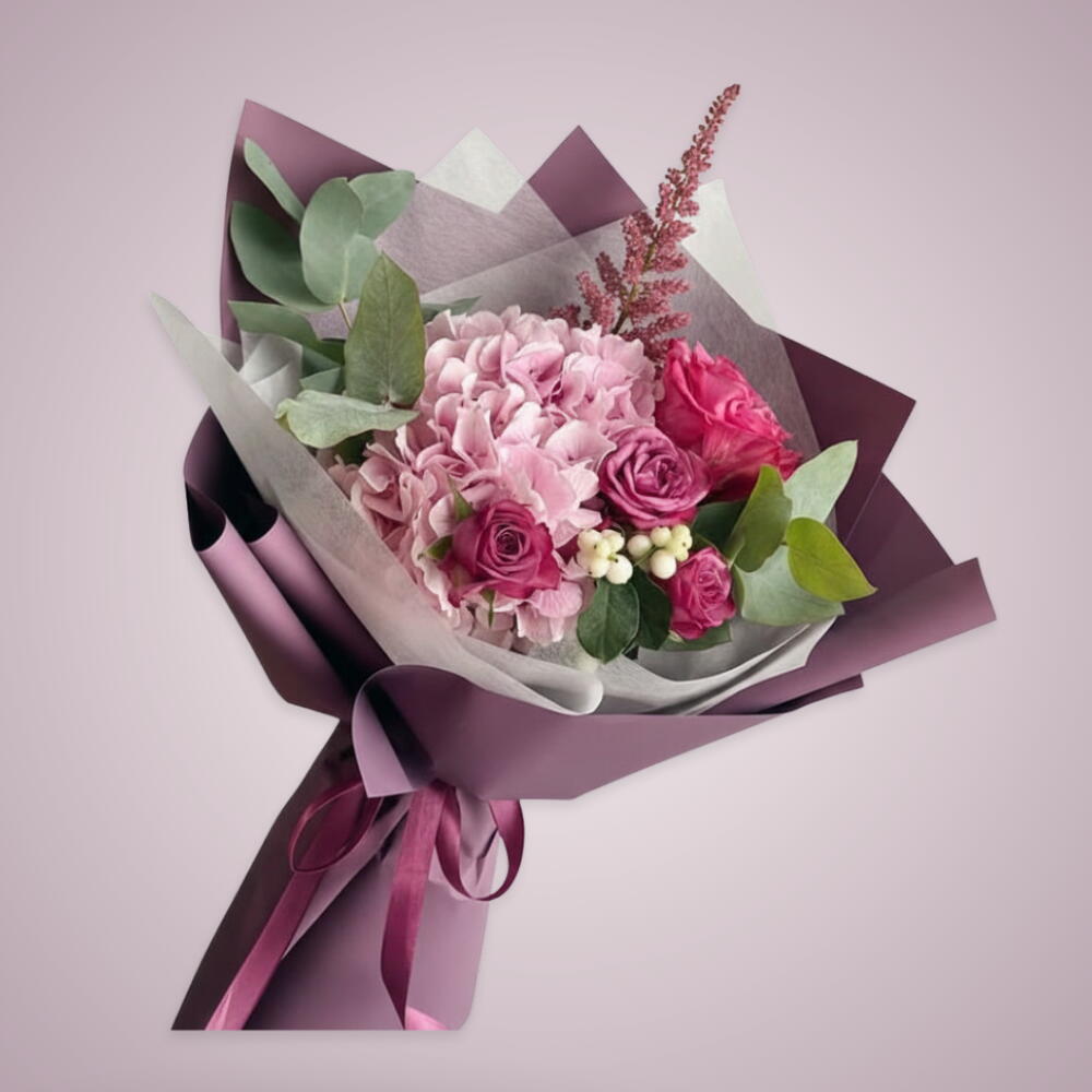 1 стебель розовой гортензии, 5 стеблей фиолетовой розы, 1 стебель лемонии, 2 стебля эвкалипта