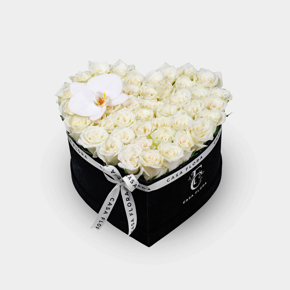 rose white - 50 шт. white orchid - 1 шт. чёрная коробка в форме сердца - 1 шт.