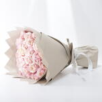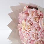 премиальная роза розового цвета (несколько оттенков) - 30 шт. белая лента baaqat - 3 шт. коричневая упаковочная бумага - 12 шт.