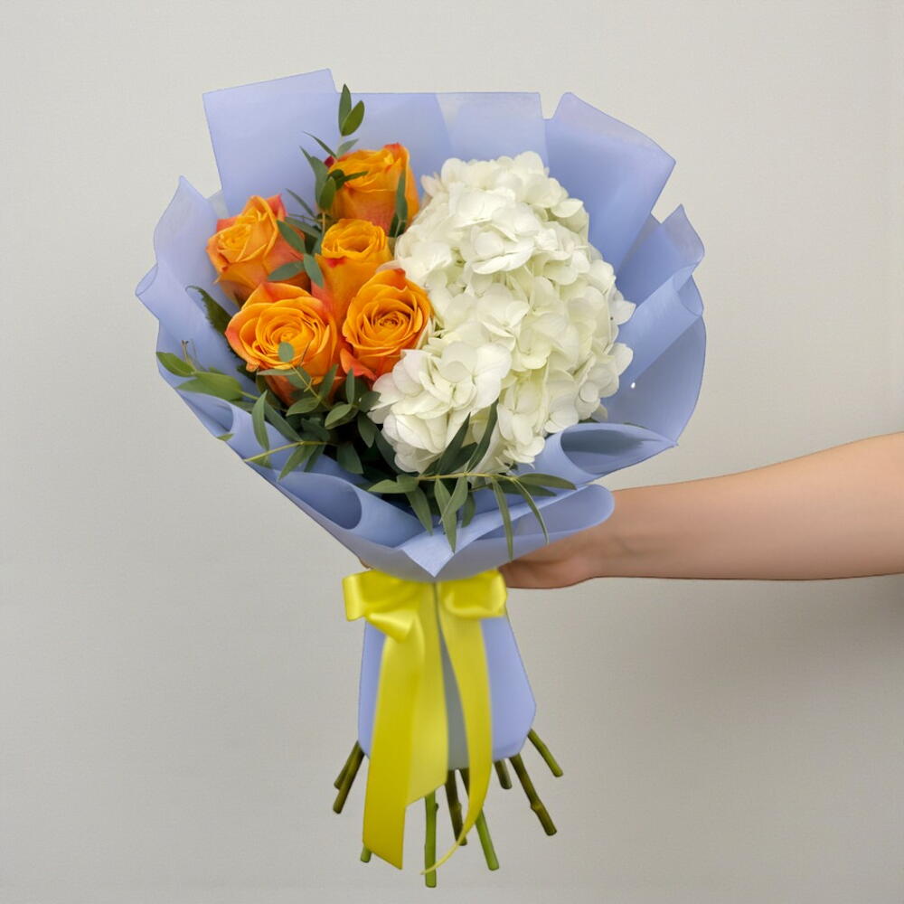 Описание - Букет из 2 белых гортензий и 5 оранжевых роз в фиолетовой упаковке.