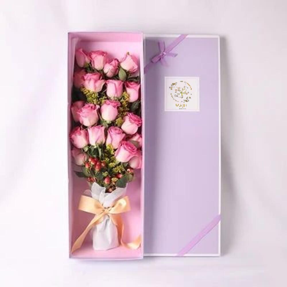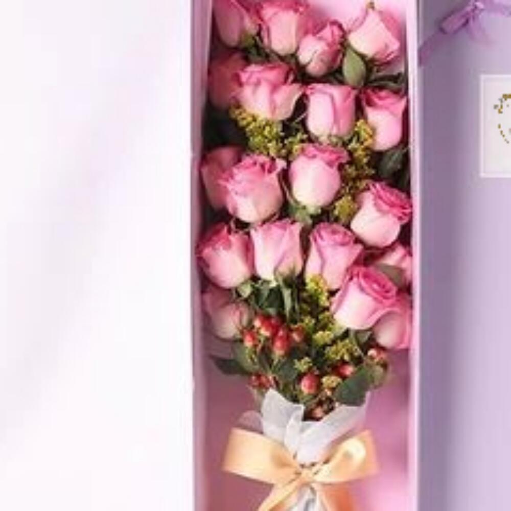 Роскошная коробка из 25 премиальных нежно-розовых роз, красиво оформленных и завернутых в мягкую серую бумагу с гладкой атласной лентой. Помещённая в матовую подарочную коробку с декоративной лентой, эта композиция — идеальный символ чистоты, элегантности и вечной любви. Идеально подходит для свадеб, проявлений сочувствия, юбилеев или когда вы