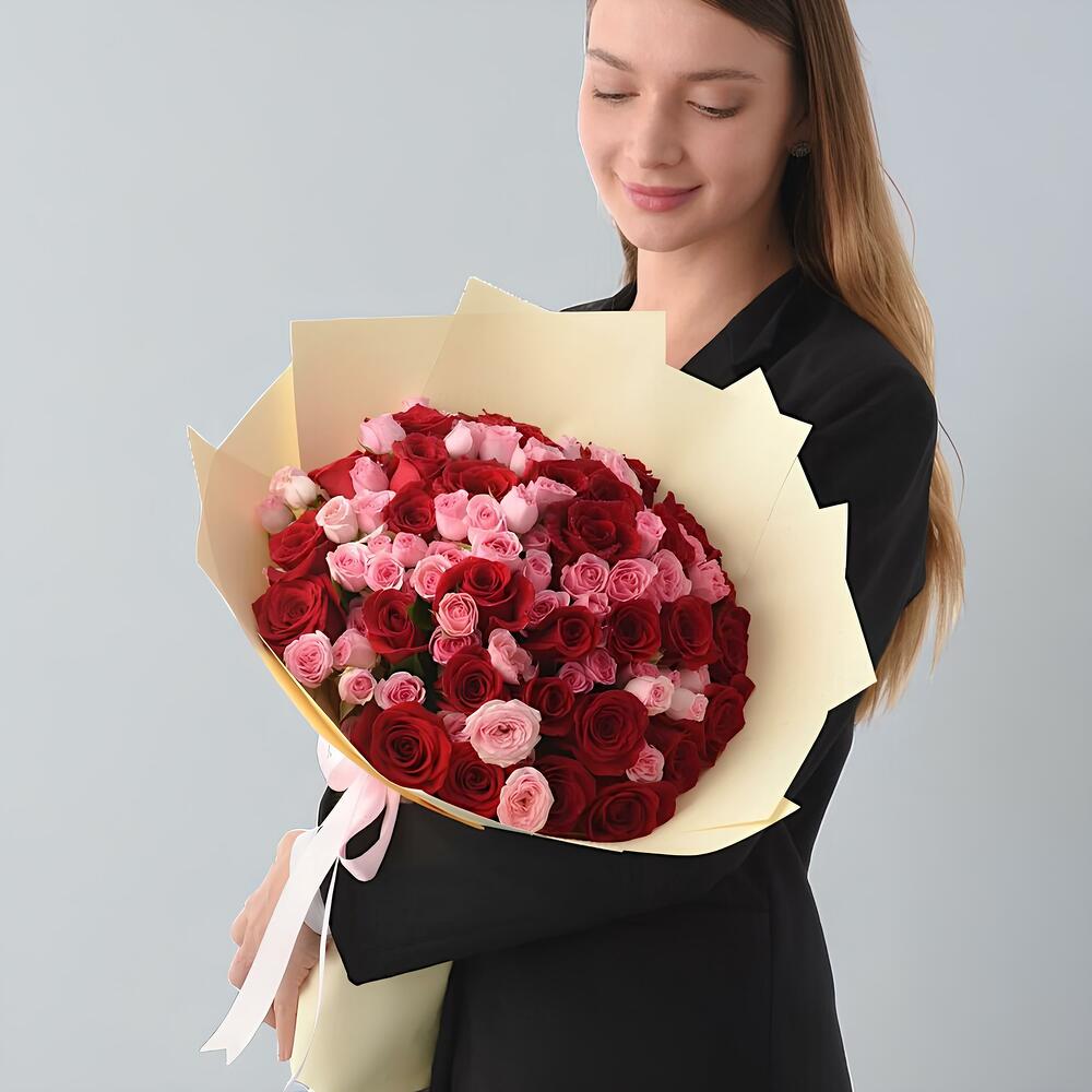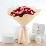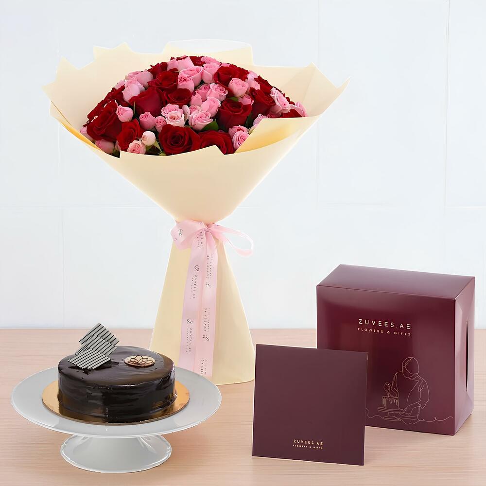 Отпразднуйте любовь с этим изысканным букетом из 30 бархатистых красных роз и 20 нежных розовых кустовых роз, изящно дополненным пышной зеленью рускуса. Элегантно упакованный в кремовую бумагу и перевязанный нежно-розовой лентой, этот букет — сердечное выражение страсти и нежности. В комплекте с изысканным полкилограммовым шоколадным тортом и открыткой с посланием этот роскошный набор — идеальный способ сделать любое особое событие незабываемым.