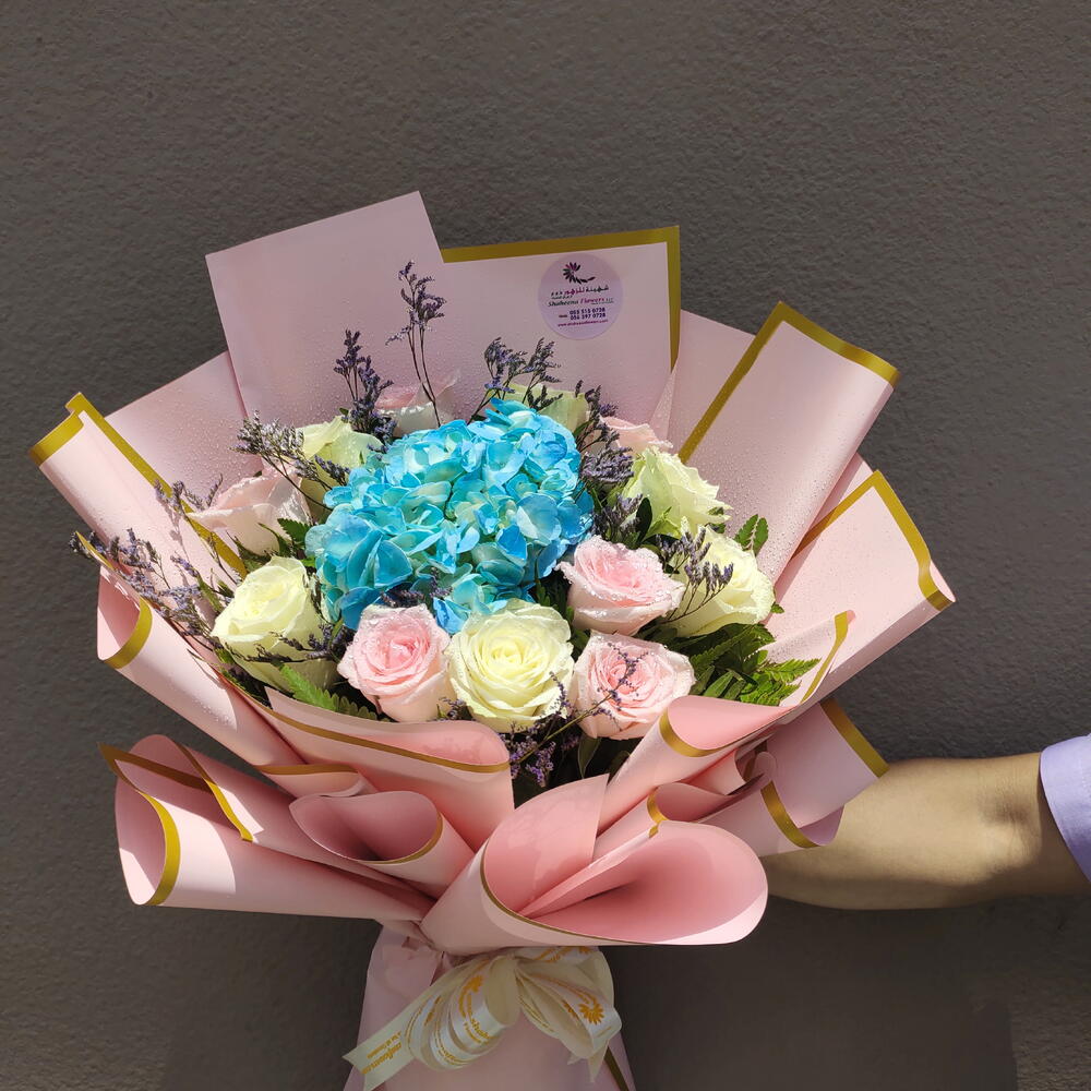 Pink rose - 6 шт. White rose - 6 шт. blue hydrangea - 1 шт.